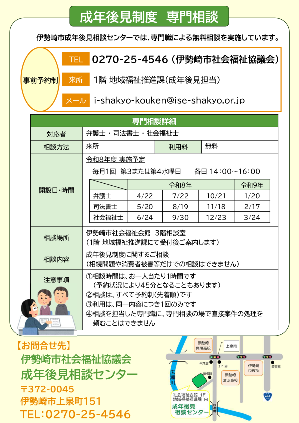 | お問い合わせ先 | 地域福祉推進課内 成年後見相談センター 〒372-0045 群馬県伊勢崎市上泉町151番地 TEL 0270-25-4546 FAX 0270-21-8252 MAIL i-shakyo-kouken@ise-shakyo.or.jp |