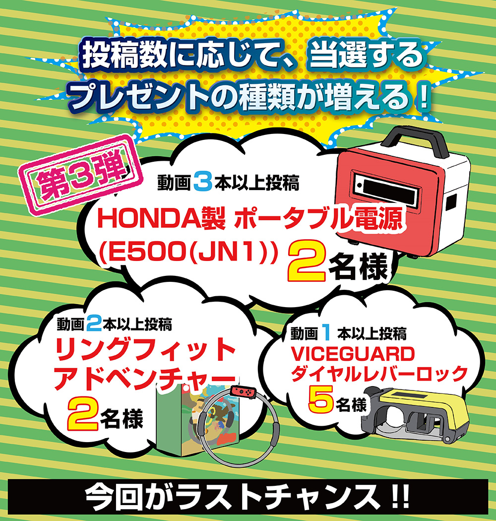 - 動画を3本以上ご投稿された方はすべての商品の中からいずれかが当選する可能性がございます。