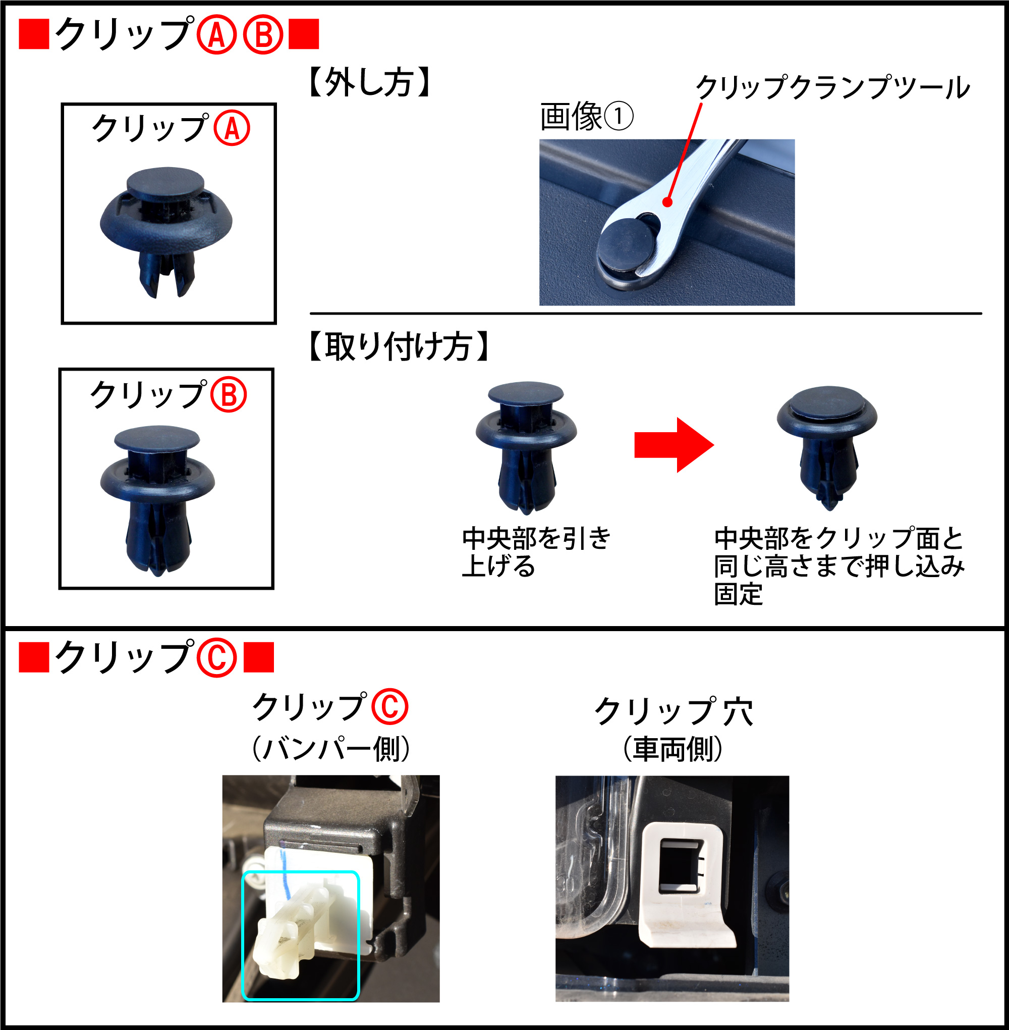 ※フックやクリップで固定された部分を力まかせに引っ張ると、フックやクリップ、バンパーを破損させる恐れがありますので、十分注意して作業を行なってください。また、バンパーに無理な力を加えると表面の白化や塗装のひび割れ、変形破損の原因となりますので、取り扱いには十分注意してください。
