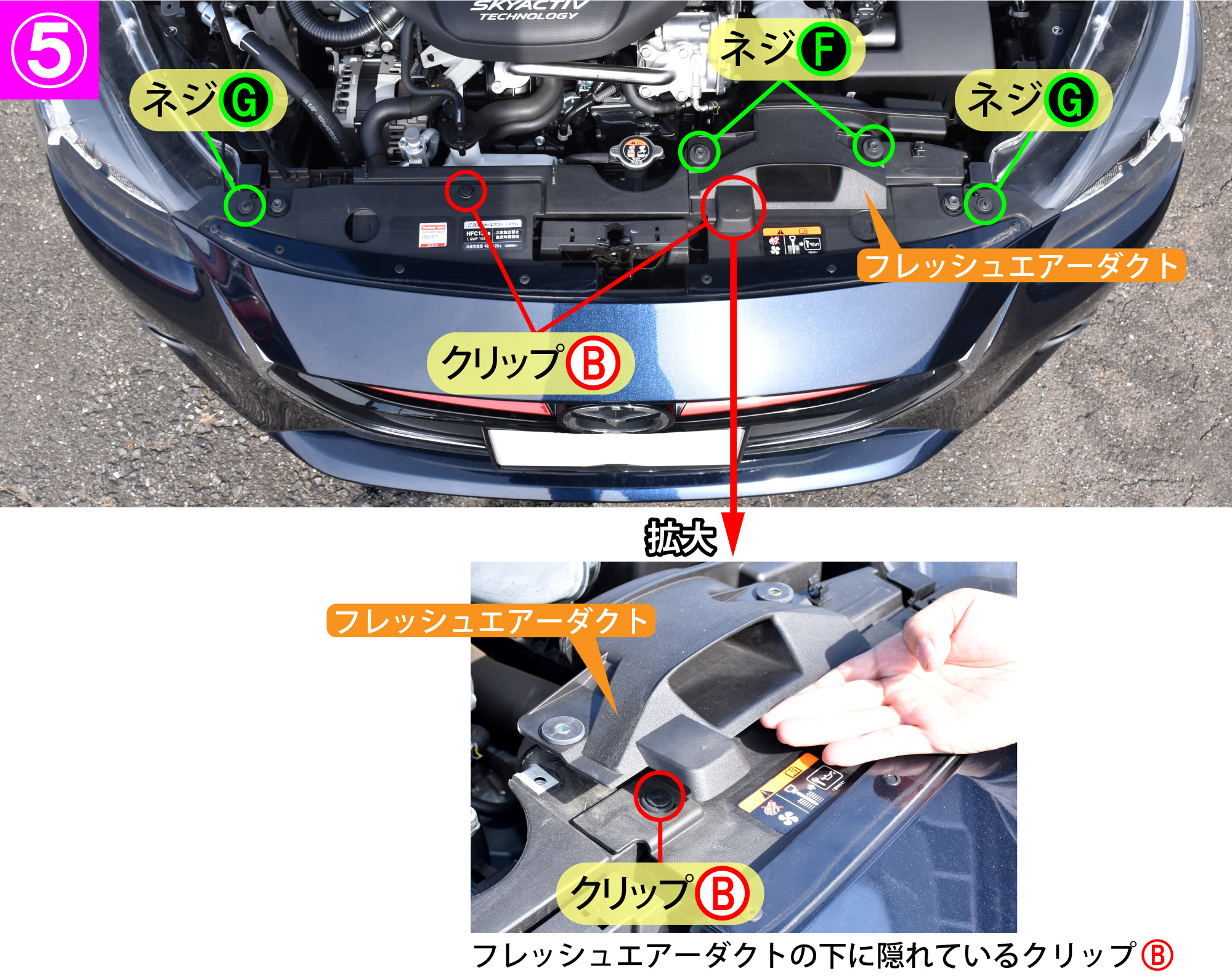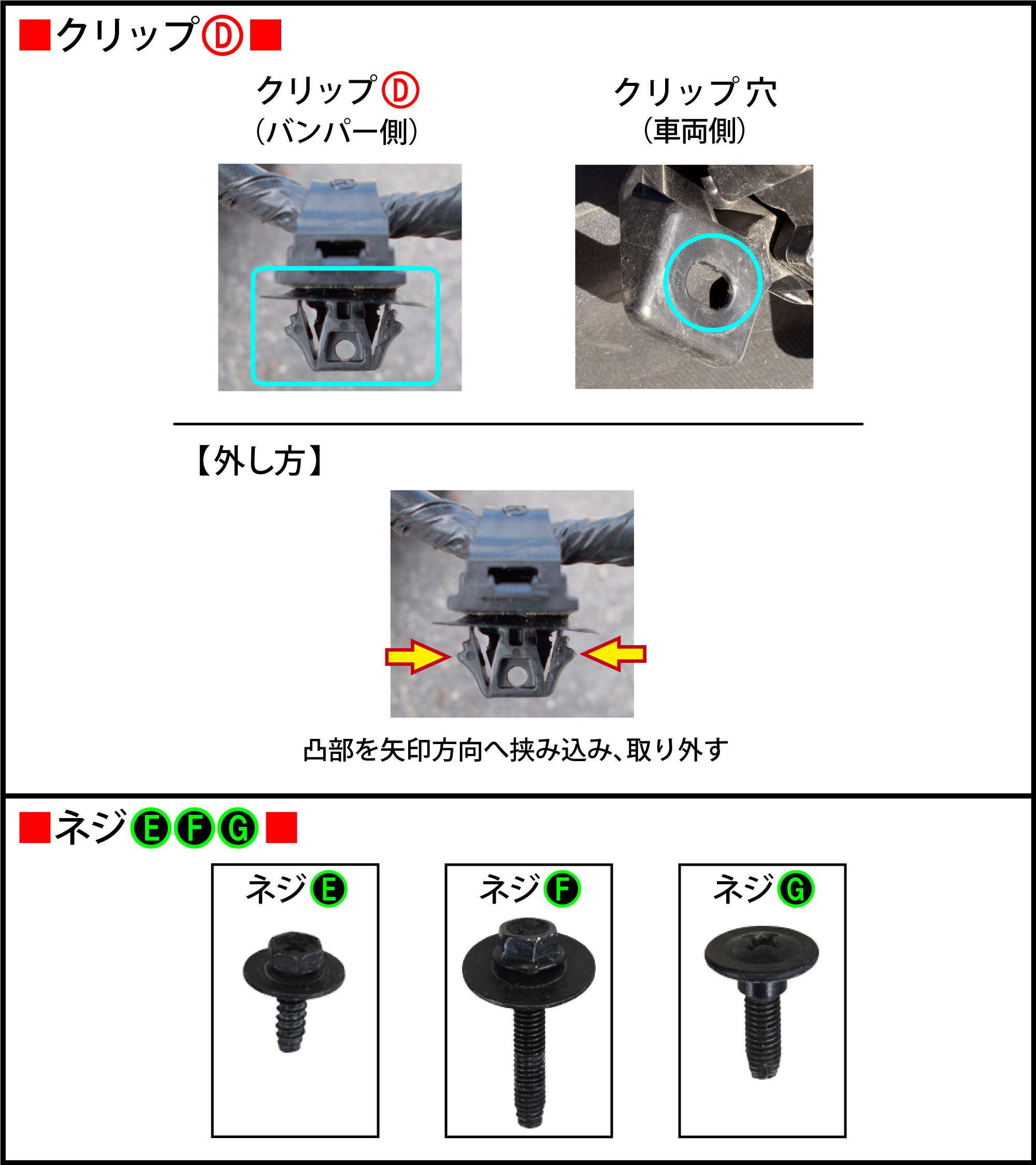 - バンパー上面にあるネジF(2箇所)とネジG(2箇所)、クリップB(2箇所)を外します。