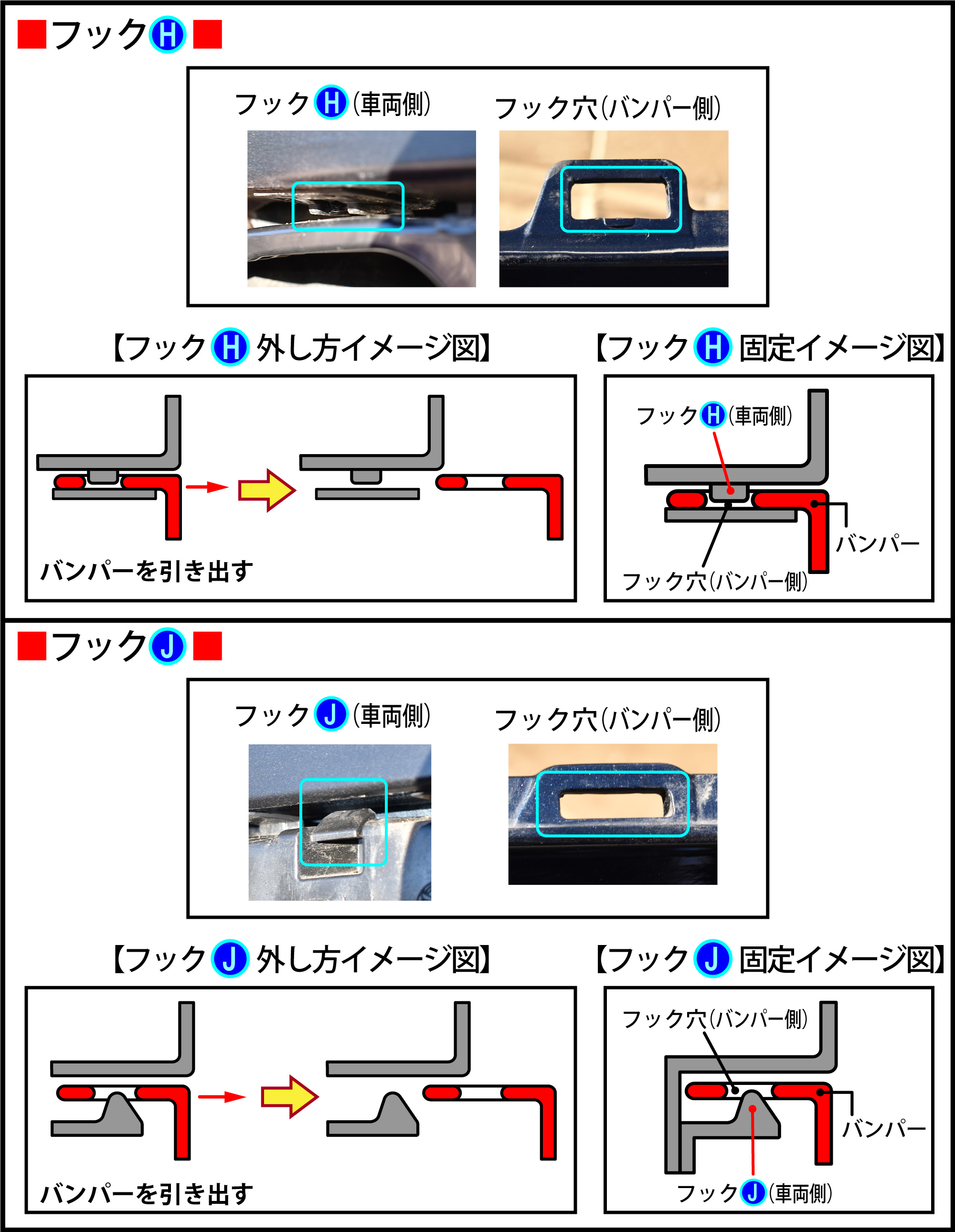 『フックJ外し方イメージ図』のようにバンパーを引き出します。