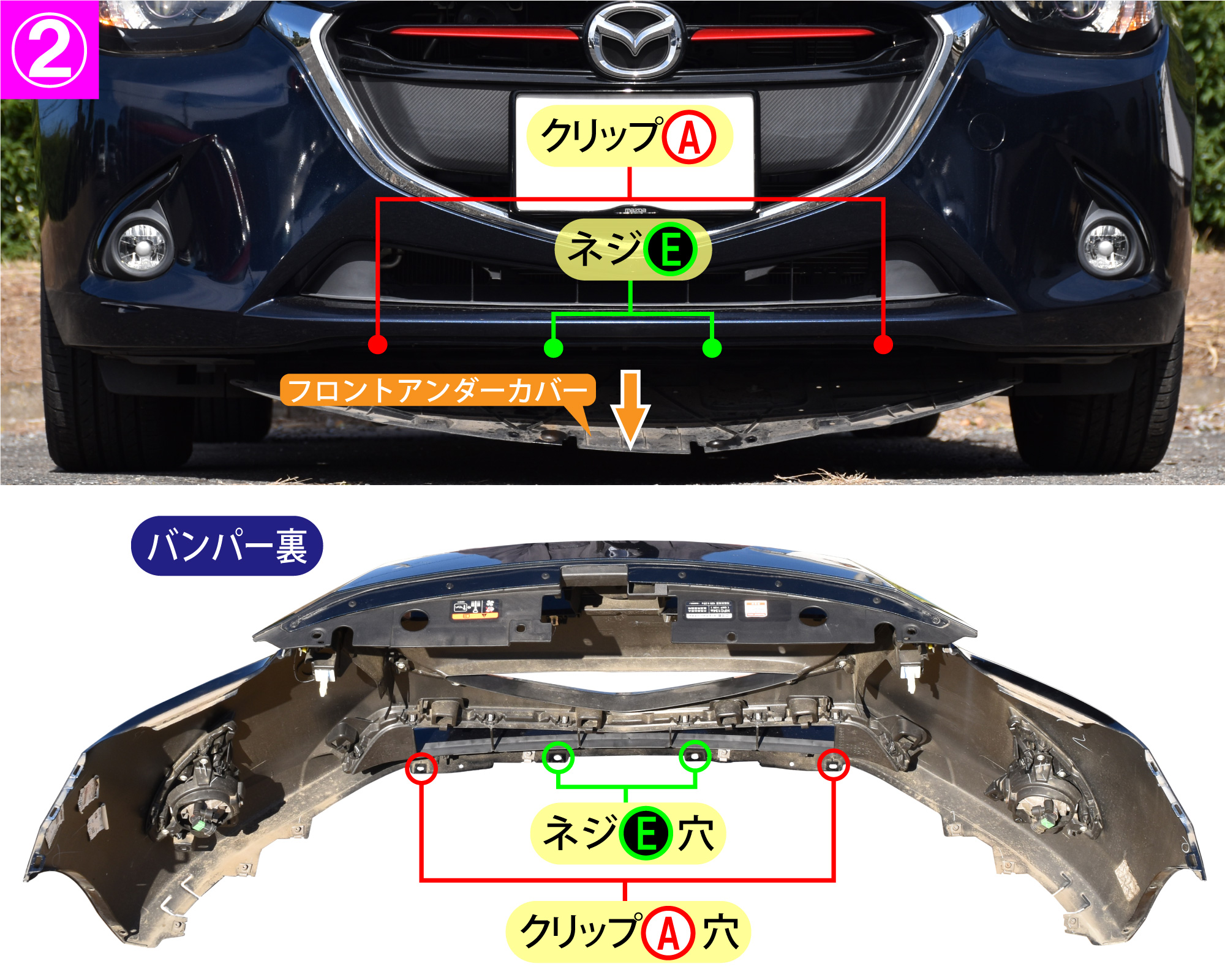 - バンパー下面のクリップA(2箇所)とネジE(8箇所)を外します。