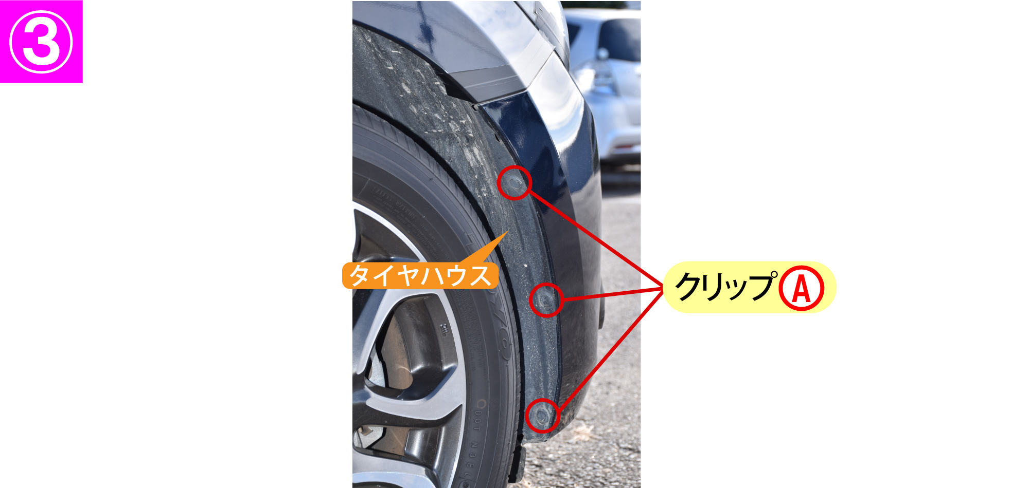 - タイヤハウス内のクリップA(左右各3箇所)を外します。