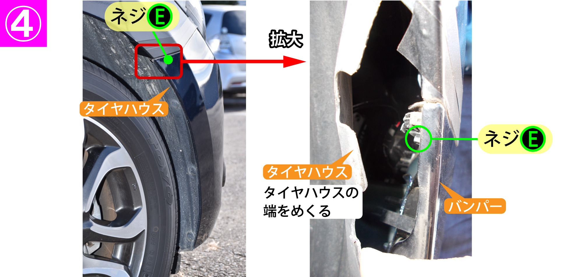 - タイヤハウスの端をめくり、ネジE(左右各1箇所)を外します。