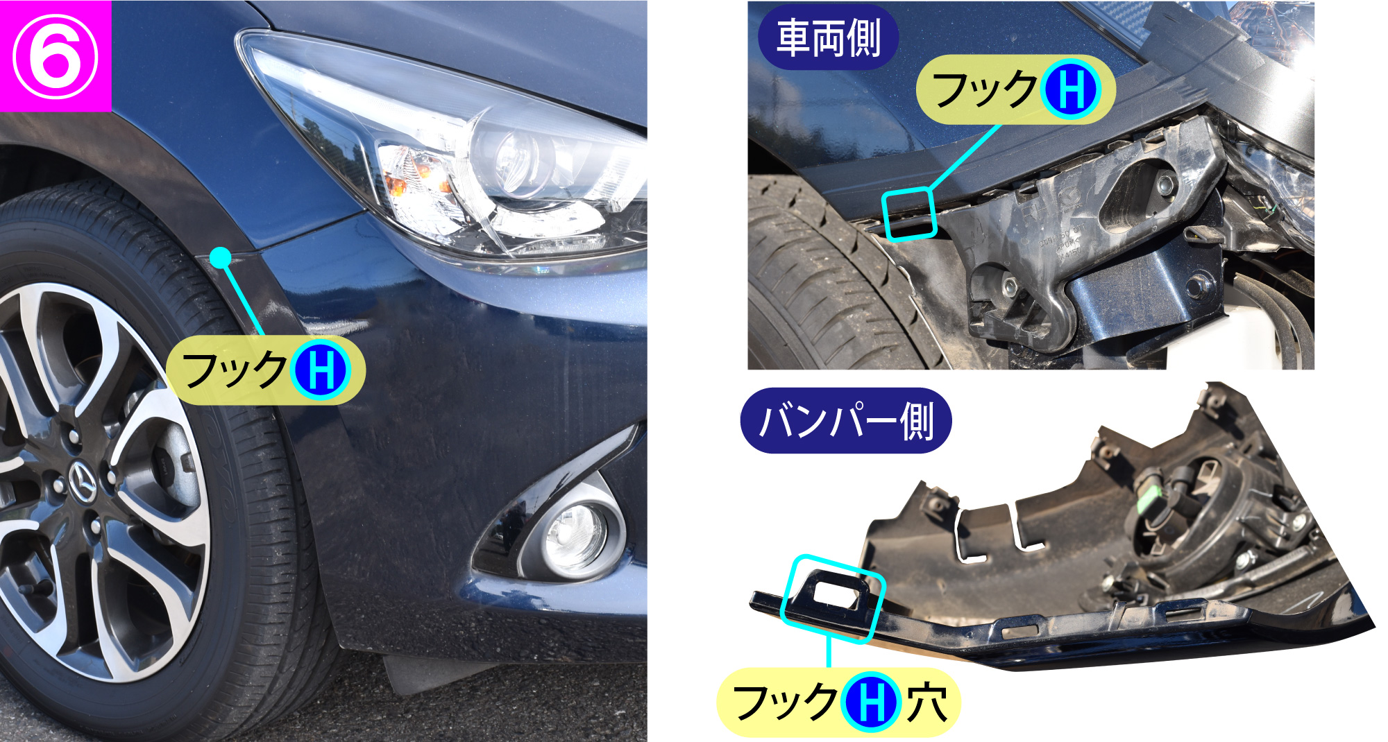 『フックH外し方イメージ図』のようにバンパーを引き出します。