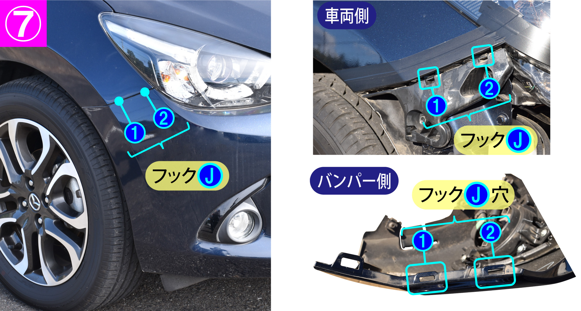 - バンパー端部のフックJ(左右各2箇所)を①~②の順番で外します。
