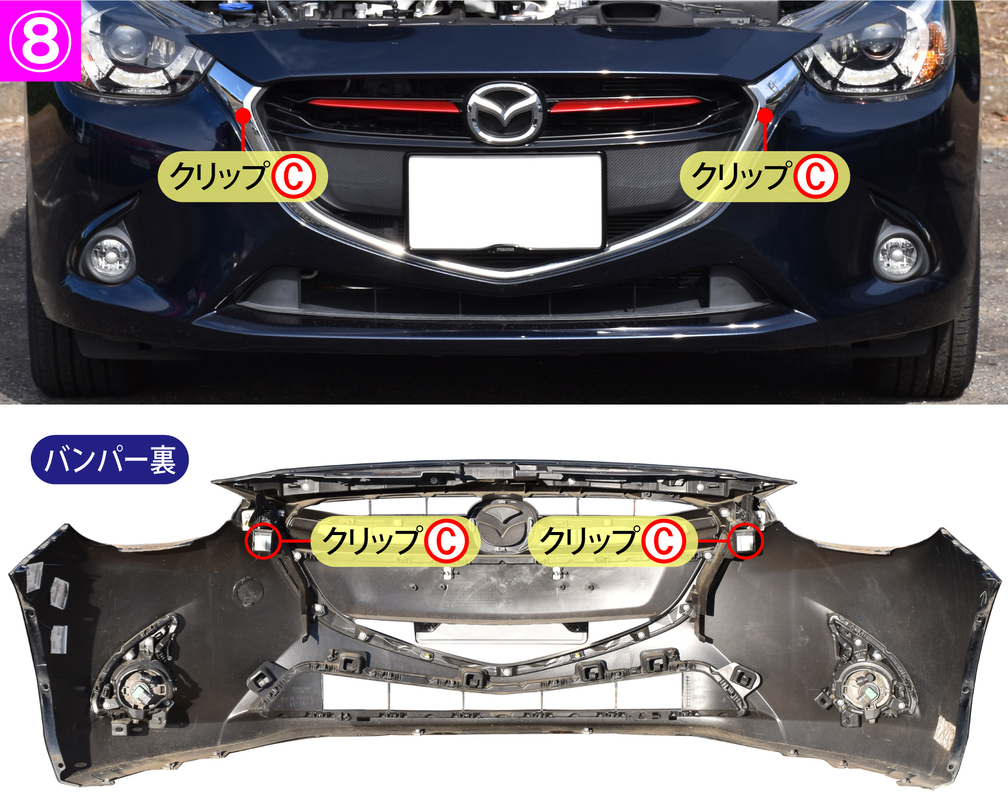 - バンパーを引き出し、クリップC(2箇所)を外すと、バンパーが外れます。 このとき、バンパー裏にフォグランプ等の部品が固定されていますので、配線などを損傷させないよう注意してください。
