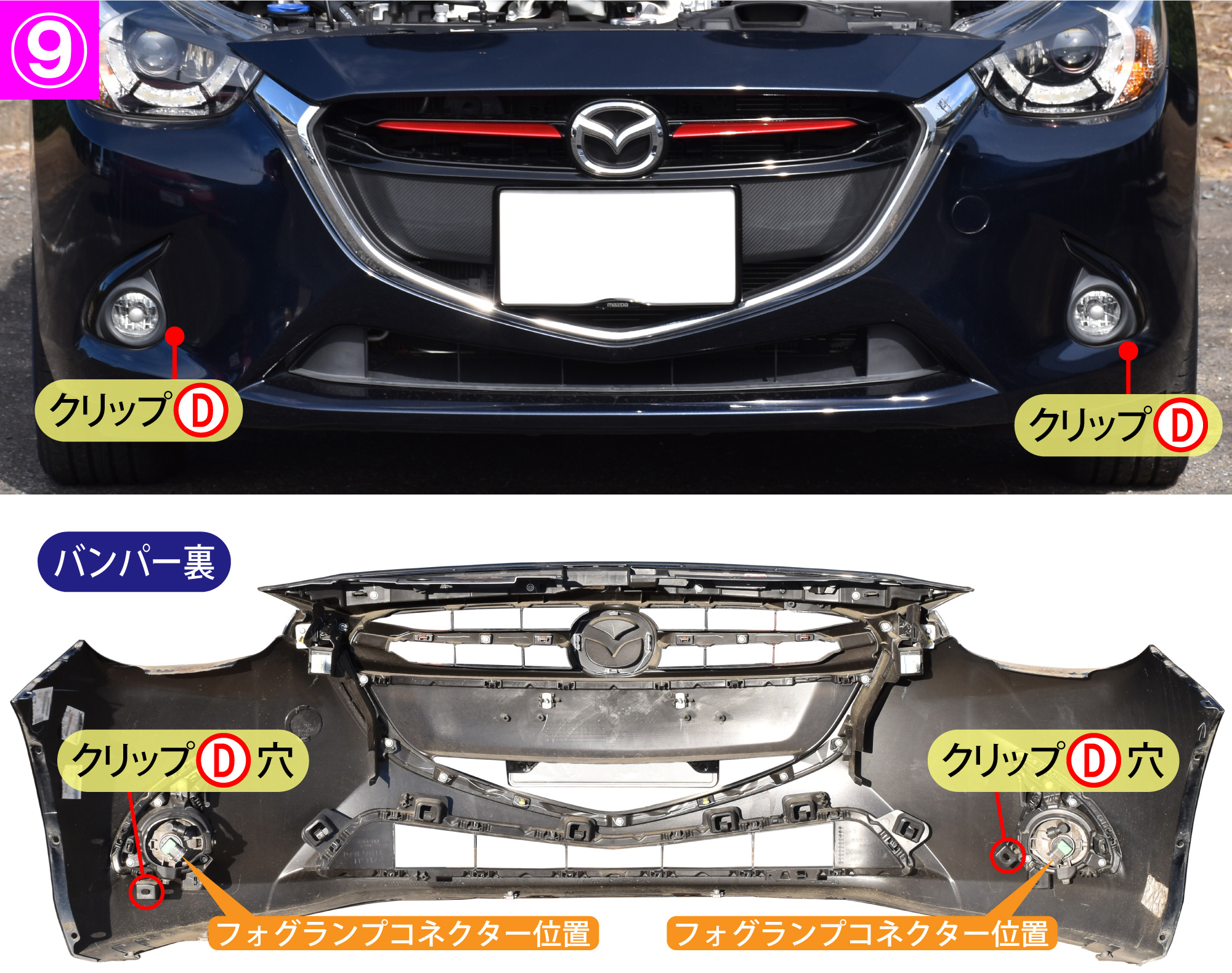 - バンパーが外れましたら、バンパー裏に固定されているフォグランプのコネクターや配線を固定しているクリップD(左右各1箇所)を外し、バンパーを安全な場所へ移動させます。