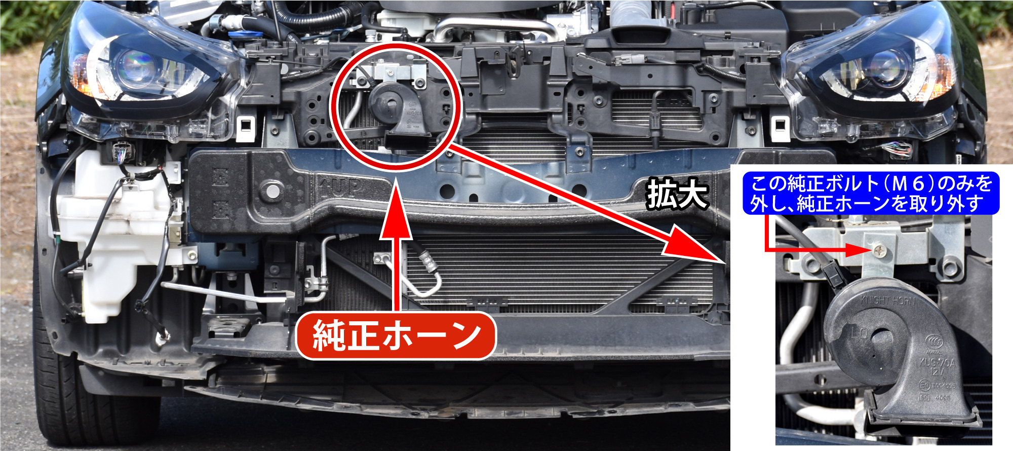 ②:助手席側ヘッドライト下の位置にある純正ボルトを一旦外し、その位置に一旦外した純正ボルトでホーンを固定します。