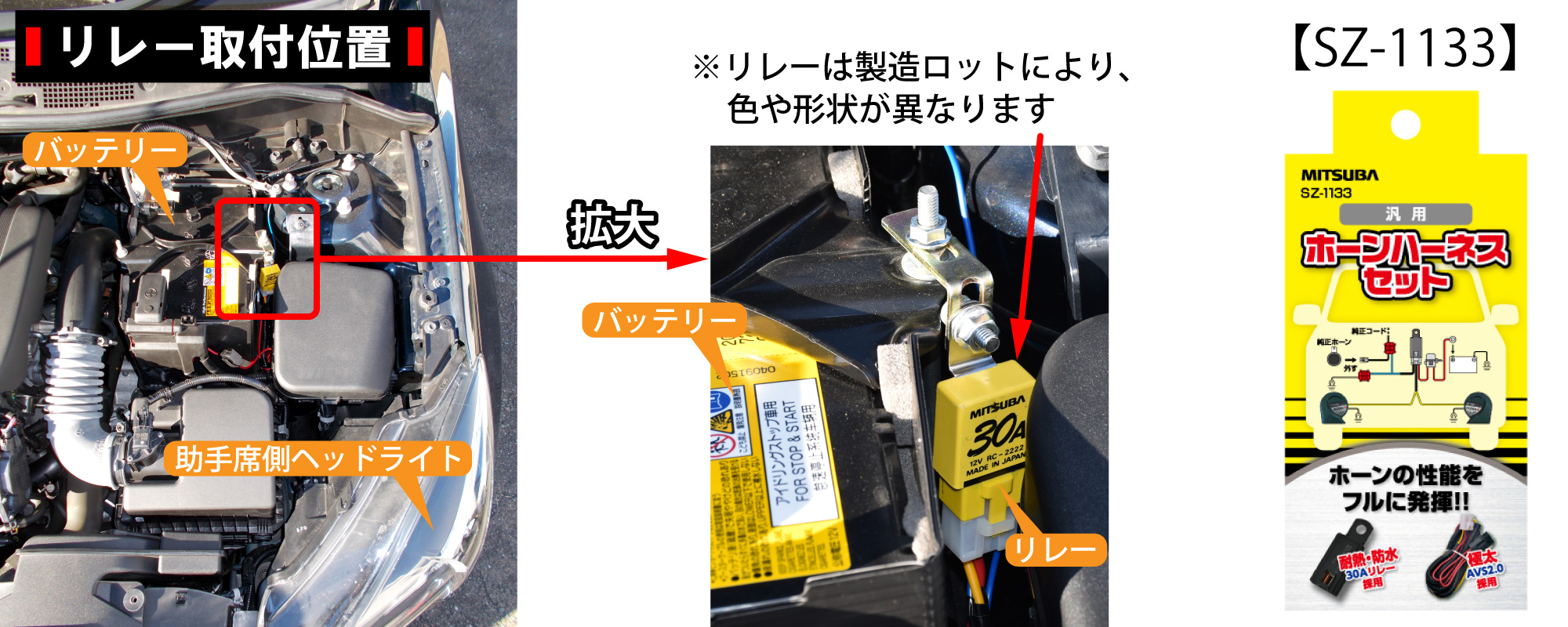 ※ホーンハーネスセット(SZ-1133)とは、ホーン接続用にリレー回路が組まれた配線キットです。ミツバ製ホーンはもちろん、各メーカーのホーンも簡単・確実・短時間で配線出来ます。