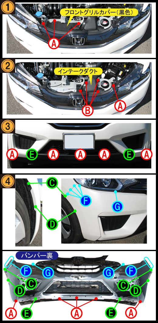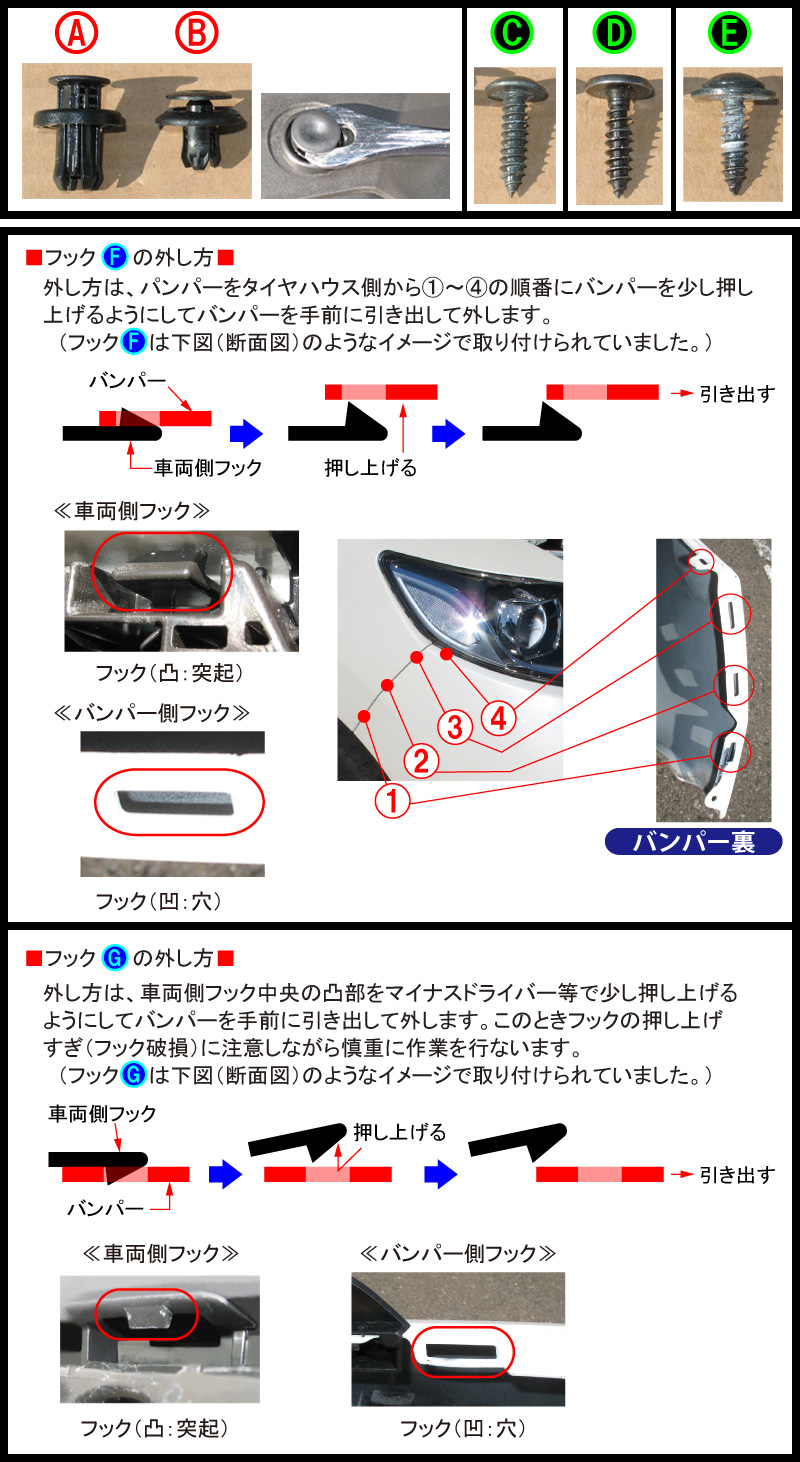 - フェンダー裏のネジC(各1箇所)、ネジD(各1箇所)を外しておき、フックF(各4箇所)、ヘッドライト下フックG(各1箇所)を外したらバンパーを手前に引き出して取り外します。
