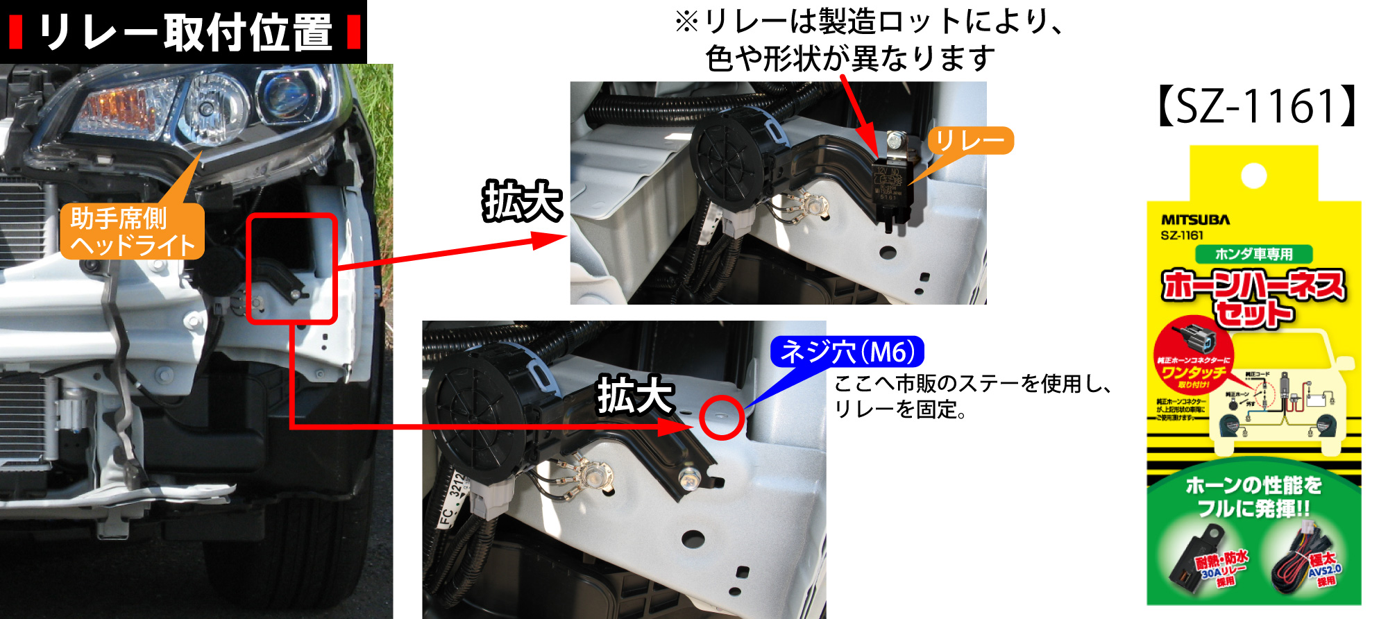ホンダ車専用ホーンハーネスセット(SZ-1161)を使用して配線します。同梱のリレーは、市販ステーを加工して画像の位置へ取り付けます。(市販ステー・ボルト・ナット別途準備)ハーネスを引き回す際は、高温になる場所や回転機等を避けてください。