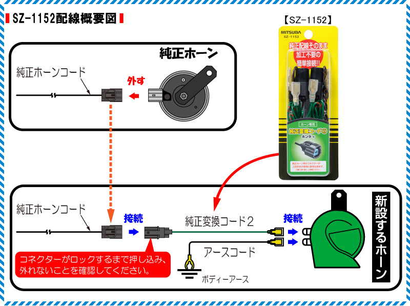 ※SZ-1152(純正変換コード2)を使用すれば、純正ホーンコネクターとの接続がワンタッチで出来るため、純正コードを傷めることがありません。参考までに、この車両に配線した配線概要図を掲載しておきます。