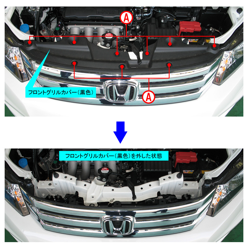 はじめにボンネットを開けて、グリル上面にあるフロントグリルカバー(黒色の樹脂カバー)のクリップA(9箇所)を外します。