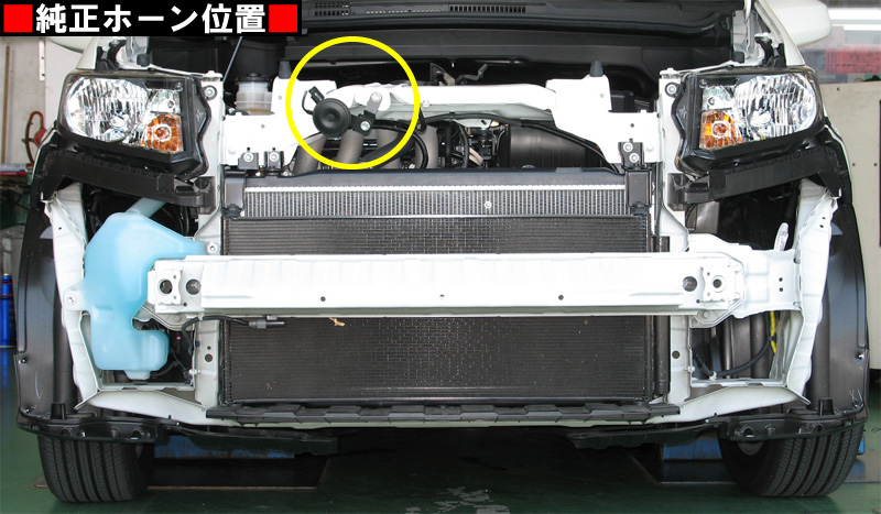 ※以後、説明のためグリルやバンパーを外した状態の画像となっておりますが、本車両はそれらを外さなくてもホーンの交換が出来ます。