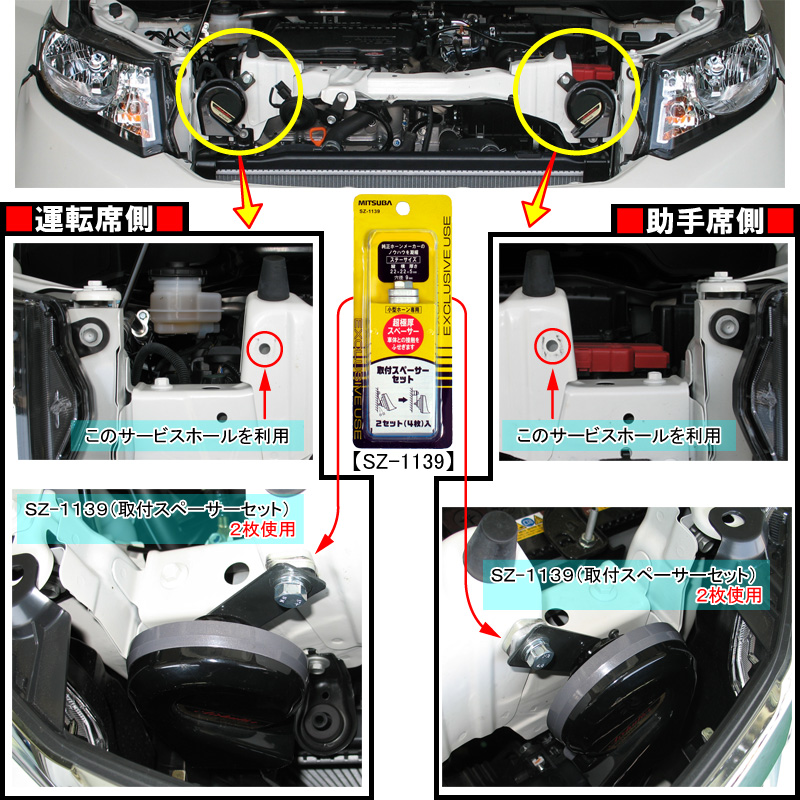 運転席側&助手席側ヘッドライト脇にあるサービスホールへ取付スペーサーセット(SZ-1139)を各々2枚使用して取り付けます。