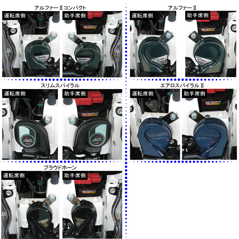 こちらの画像はアルファーⅡコンパクト、スリムスパイラル、プラウドホーン、アルファーⅡ、エアロスパイラルⅡを取り付けたときの画像です。