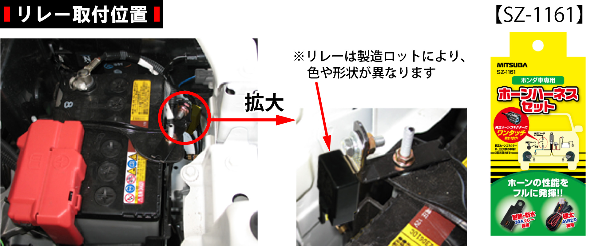 今回ホンダ車専用ホーンハーネスセット(SZ-1161)を使用して取り付けを行ないます。このハーネスを使用することで、純正ホーンコネクターとの接続がワンタッチで出来るため、純正コードを傷めることがありません。