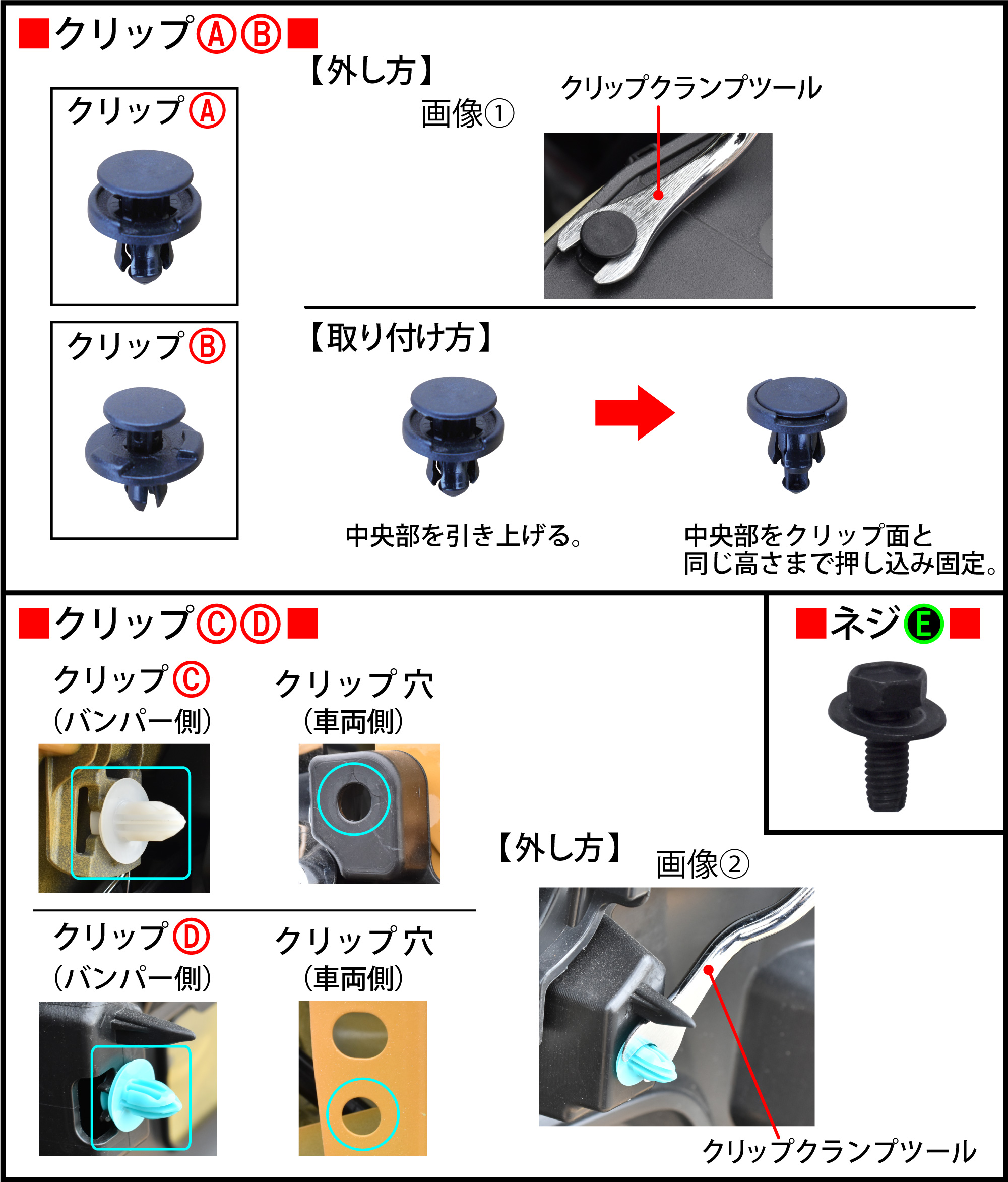 クリップクランプツール等で画像①のように中央部を少し引き上げ、クリップ全体を手で引き抜きます。