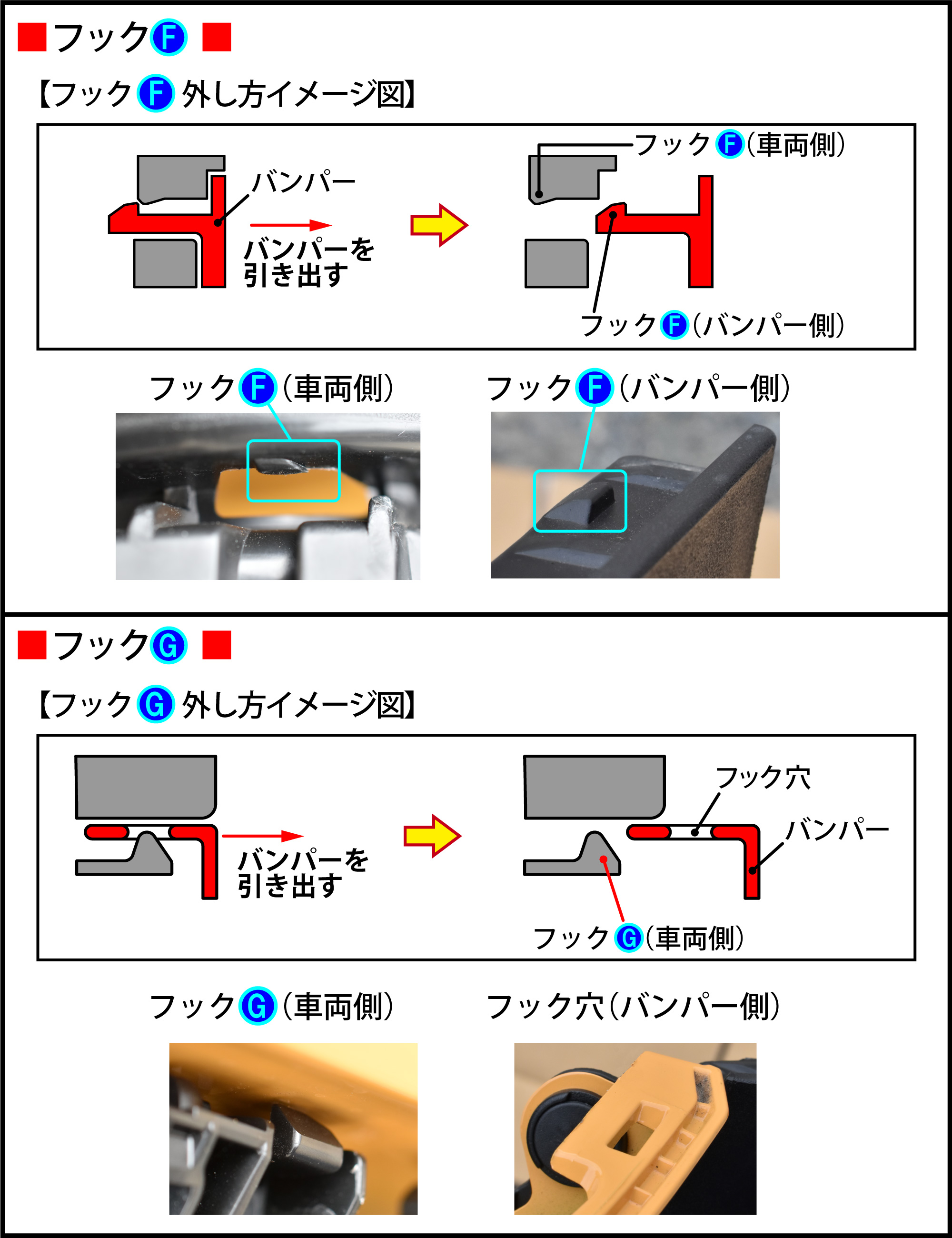 『フックF外し方イメージ図』および『フックG外し方イメージ図』のようにバンパーを引き出します。