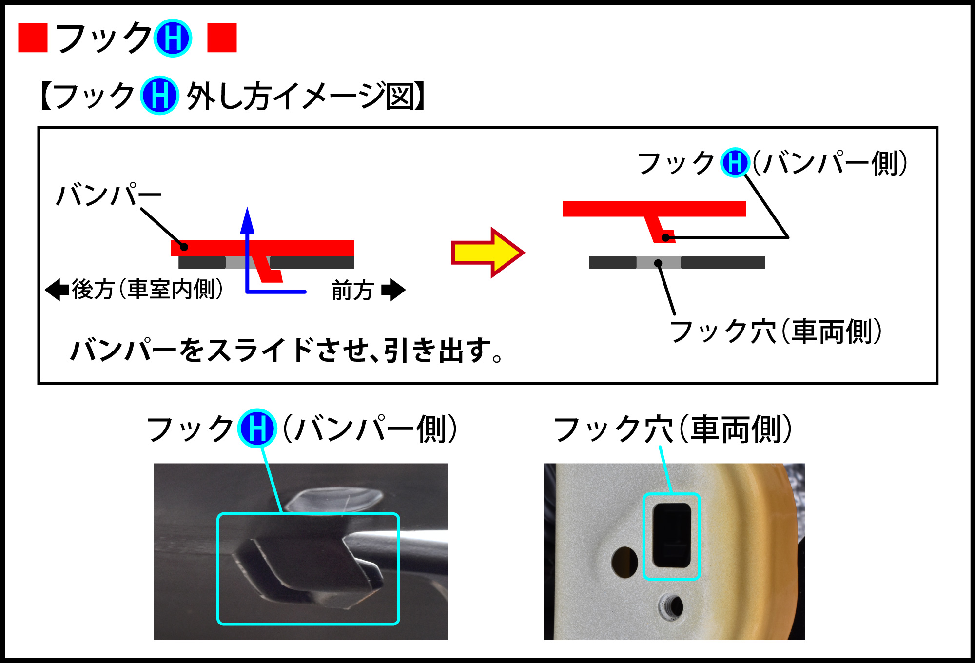 『フックH外し方イメージ図』のようにバンパーを引き出します。