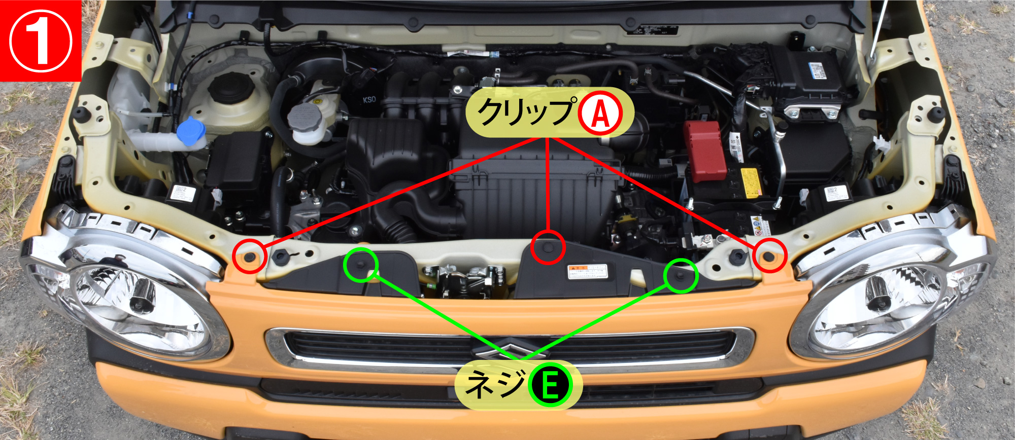 - ボンネットを開けて、バンパー上面のクリップA(3箇所)、ネジE(2箇所)を外します。