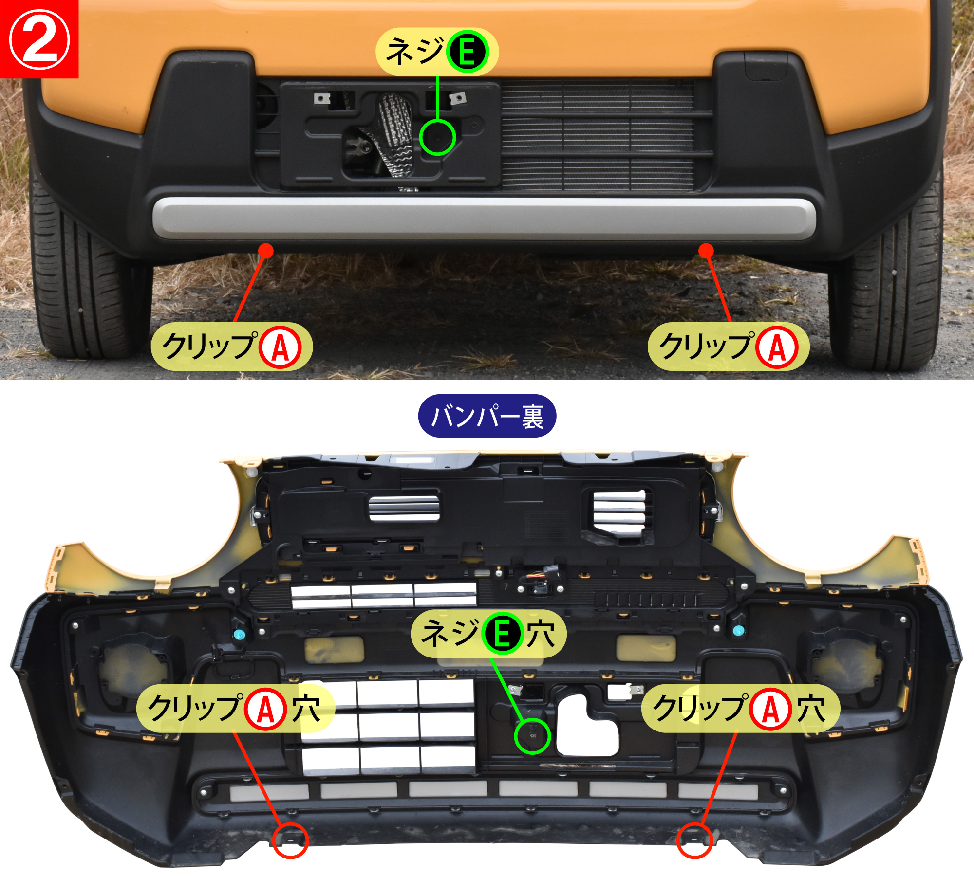 - ナンバープレートを外し、ナンバープレート裏にあるネジE(1箇所)とバンパー下面にあるクリップA(2箇所)を外します。
