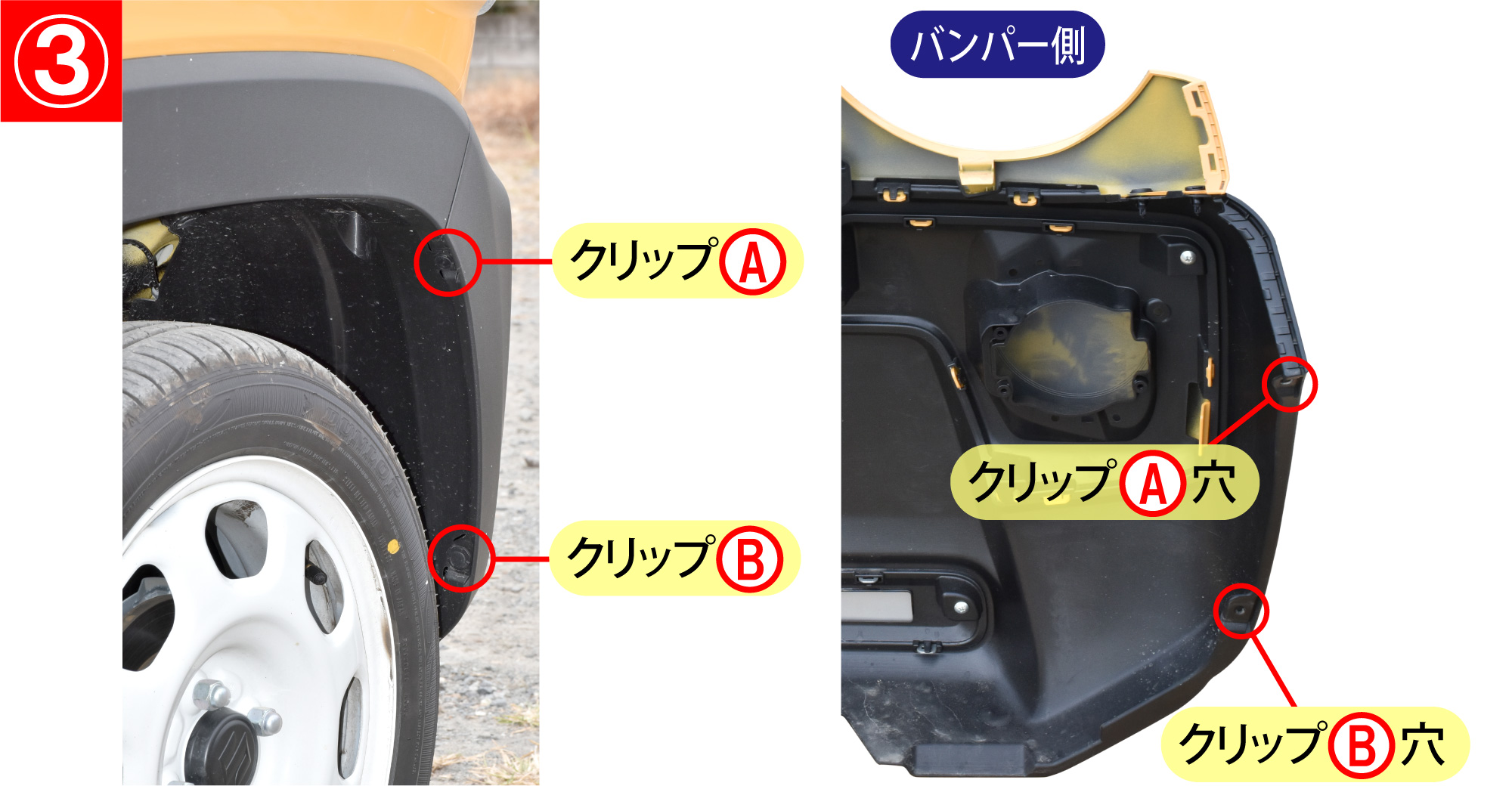 - タイヤハウス内のクリップA(左右各1箇所)とクリップB(左右各1箇所)を外します。