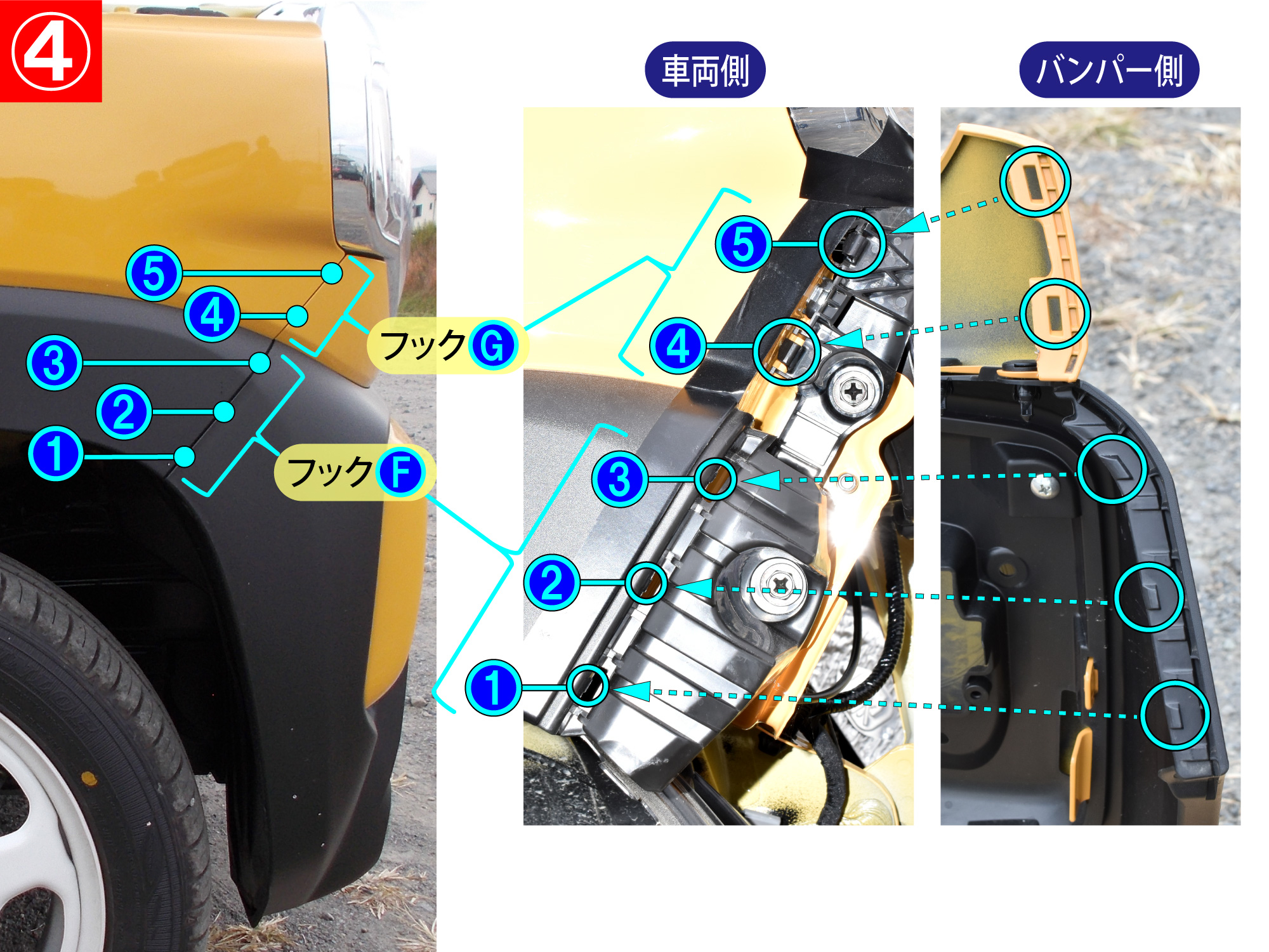 - バンパー両端部のフックF(左右各3箇所)とフックG(左右各2箇所)を①~⑤の順番で外します。