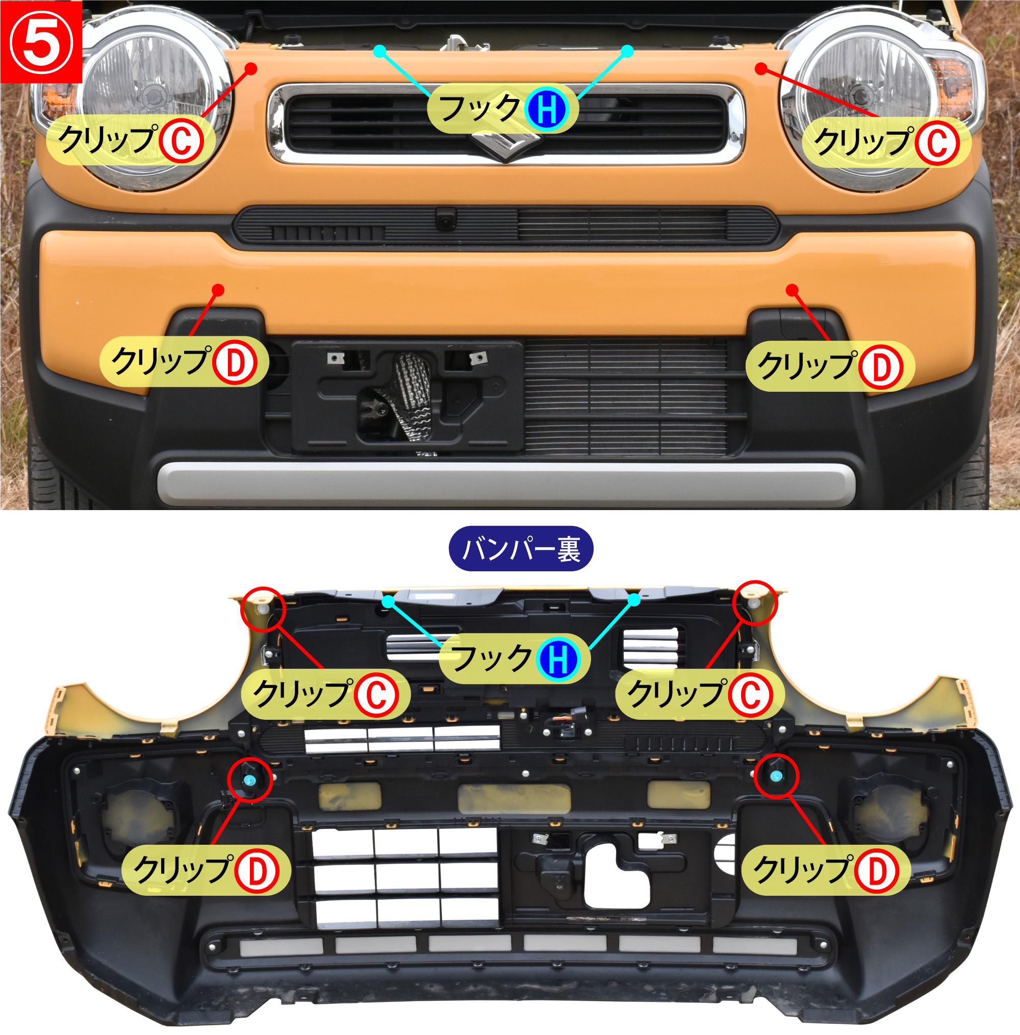 - バンパー上面裏にあるフックH(2箇所)を外してから、バンパー裏のクリップC(2箇所)とクリップD(2箇所)を外すと、バンパーが外れます。バンパー裏にはカメラ等の配線がつながれています。バンパーを引きはなし過ぎないようにしてください。