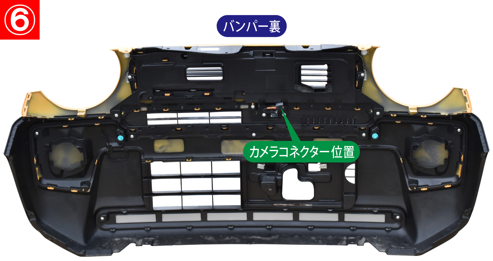 ①:取り外したバンパーを車両側へ一旦仮り付けをして『3.取り外し1-6』で取り外したコネクターを全て再接続します。