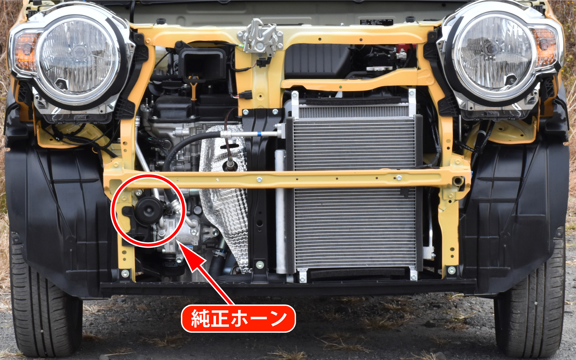 新設ホーンは、運転席側ヘッドライト脇の位置と助手席側ヘッドライト下の位置へ取り付けます。