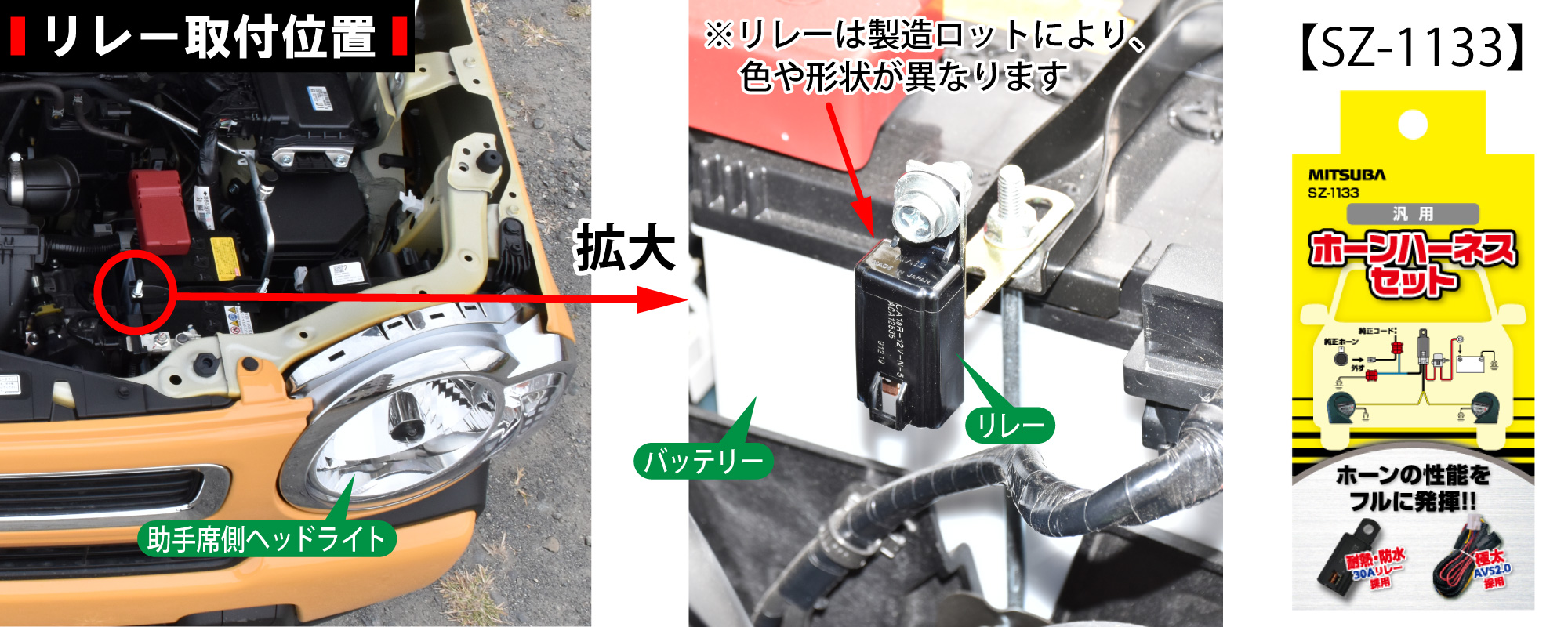 ※ホーンハーネスセット(SZ-1133)とは、ホーン接続用にリレー回路が組まれた配線キットです。ミツバ製ホーンはもちろん、各メーカーのホーンも簡単・確実・短時間で配線出来ます。