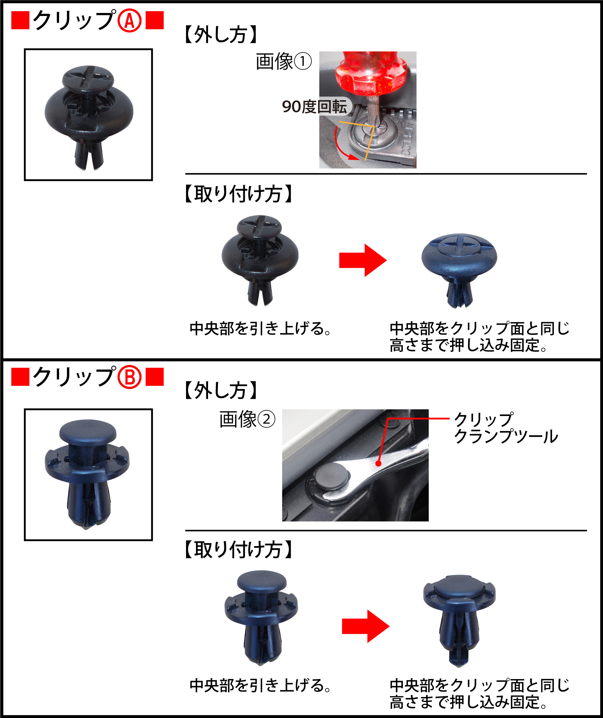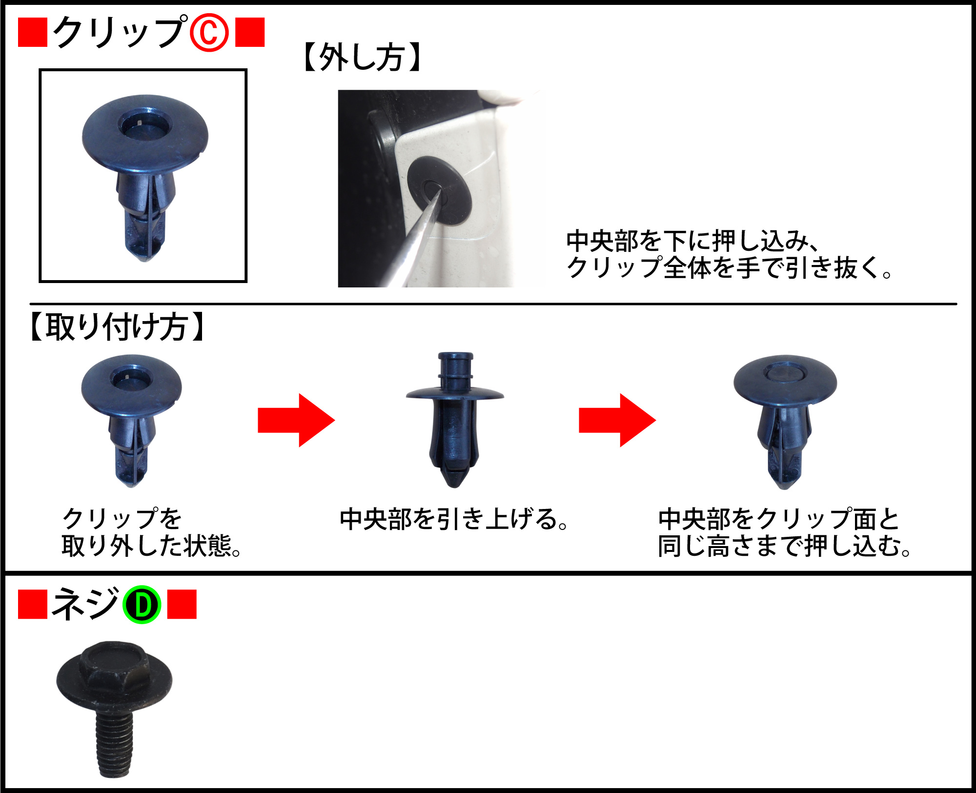 2.事前準備、クリップ、フック、ネジの形状とクリップ、フックの外し方・取り付け方