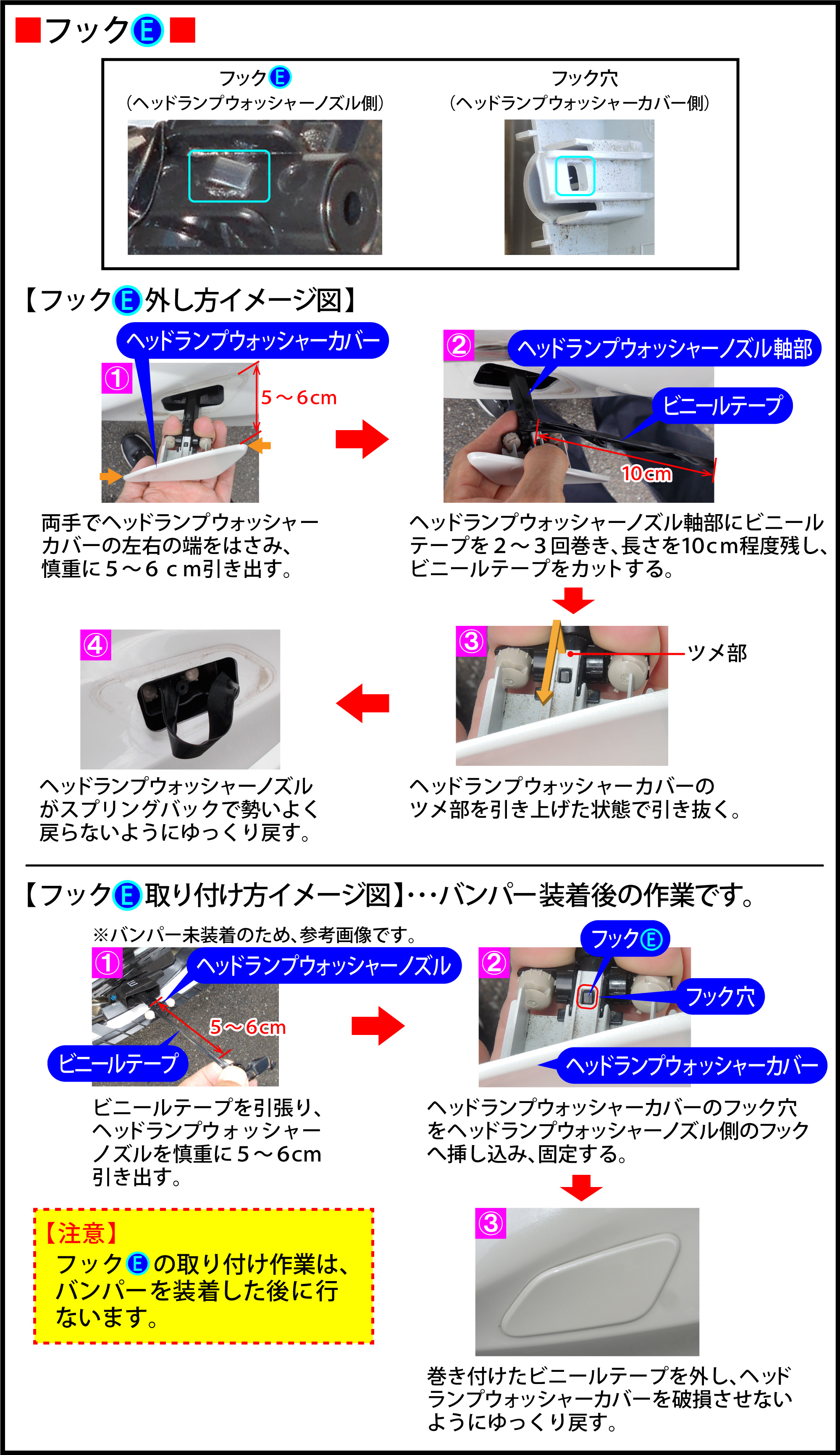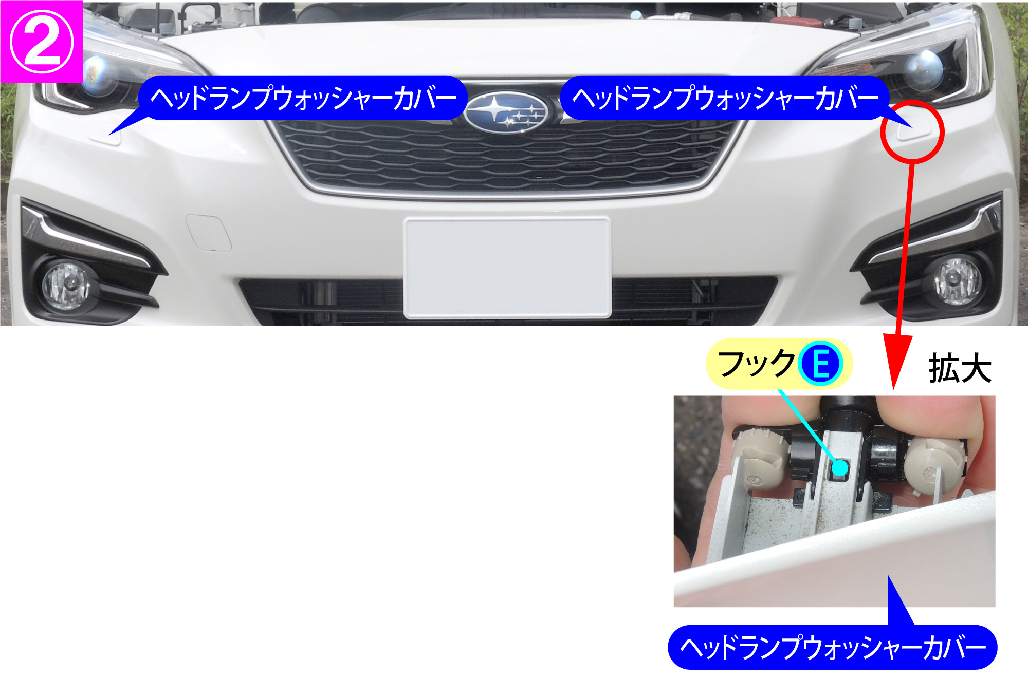 フックE(ヘッドランプウォッシャーカバーの外し方・取り付け方)