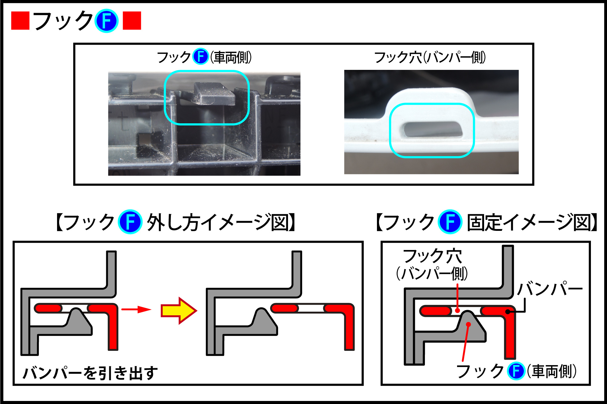 『フックF外し方イメージ図』のようにバンパーを引き出します。
