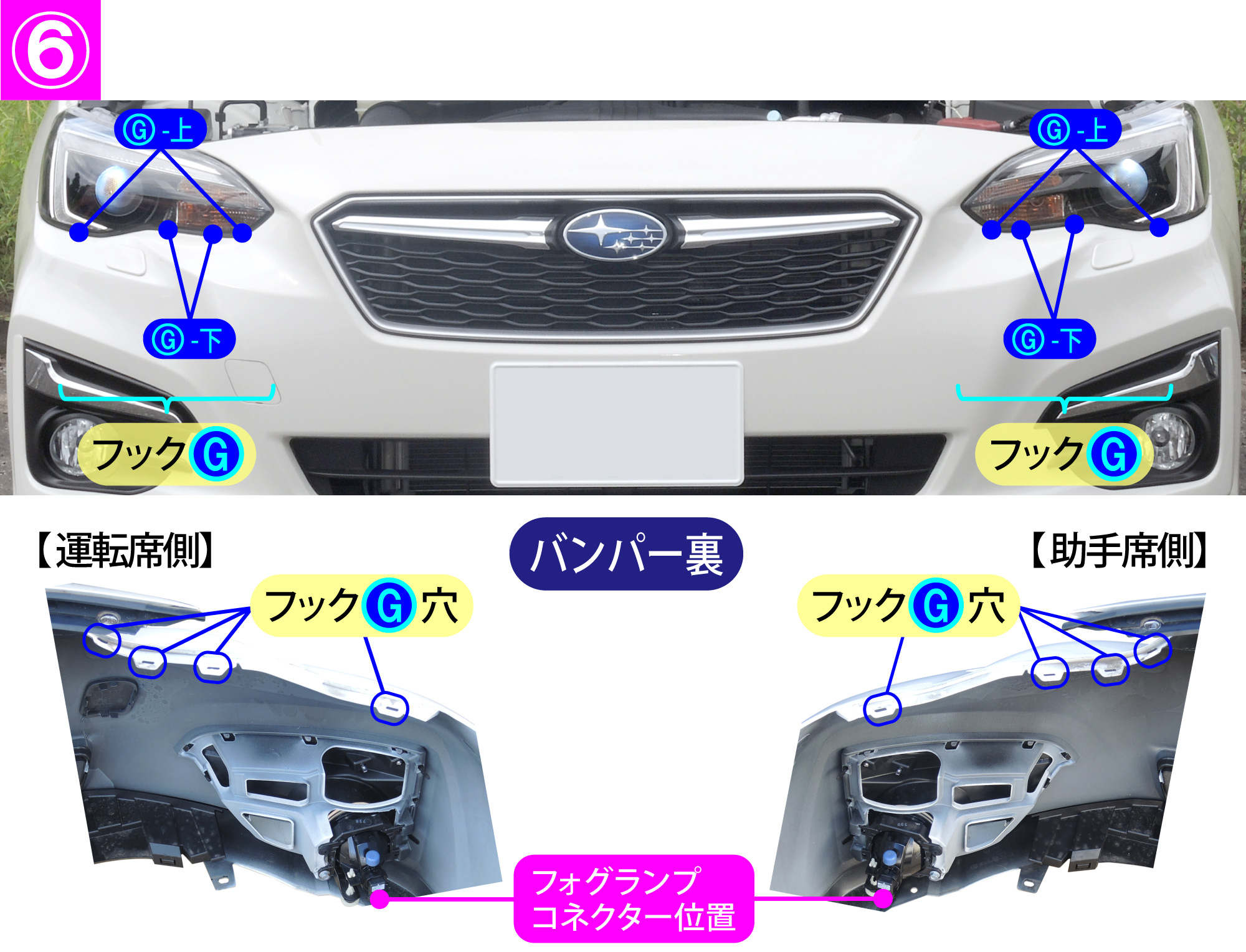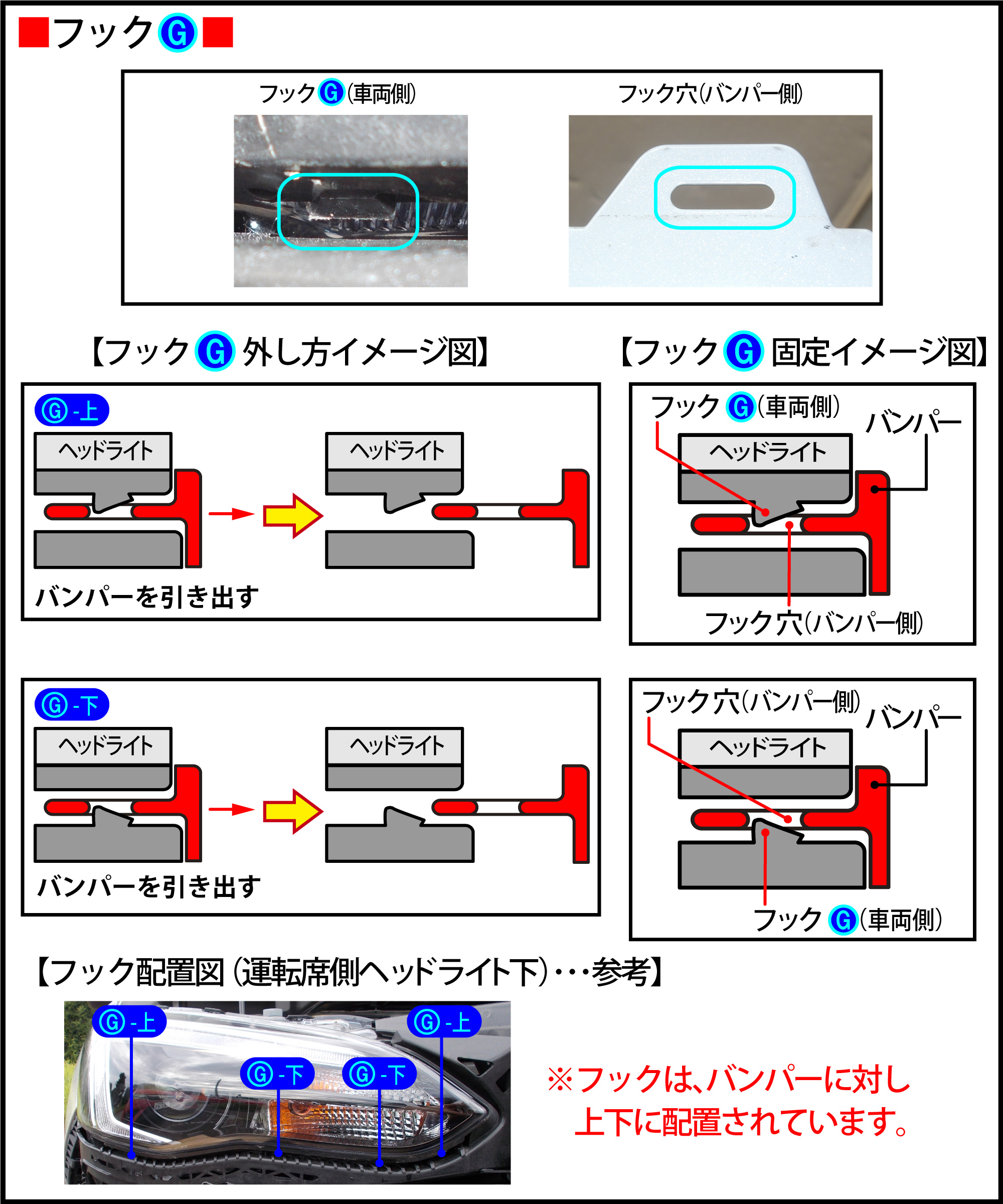- ヘッドライト下面にあるフックG(左右各4箇所)を外すと、バンパーが外れます。