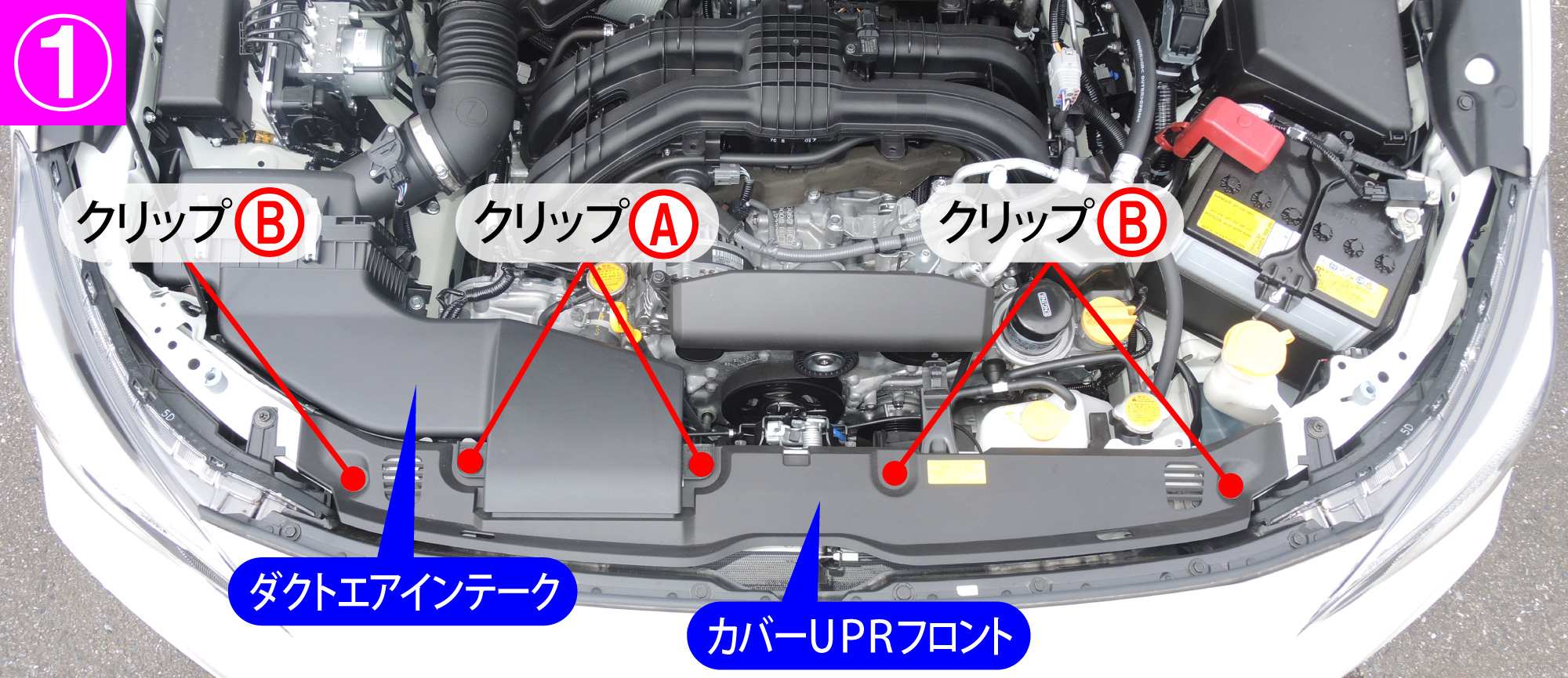 - ボンネットを開け、クリップA(2箇所)とクリップB(3箇所)を外し、ダクトエアインテークとカバーUPRフロントを外します。