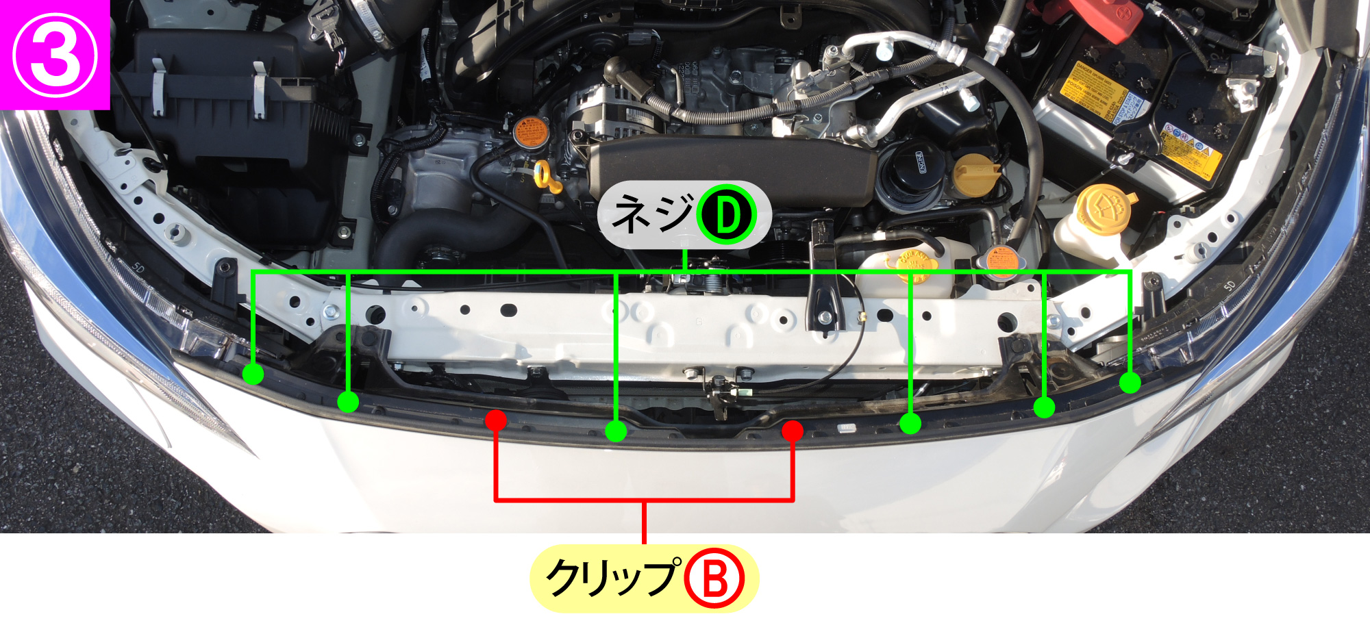 ※作業前に『2.事前準備・フックE(ヘッドランプウォッシャーカバーの外し方・取り付け方)』を確認してください。 - バンパー上面のクリップB(2箇所)とネジD(6箇所)を外します。