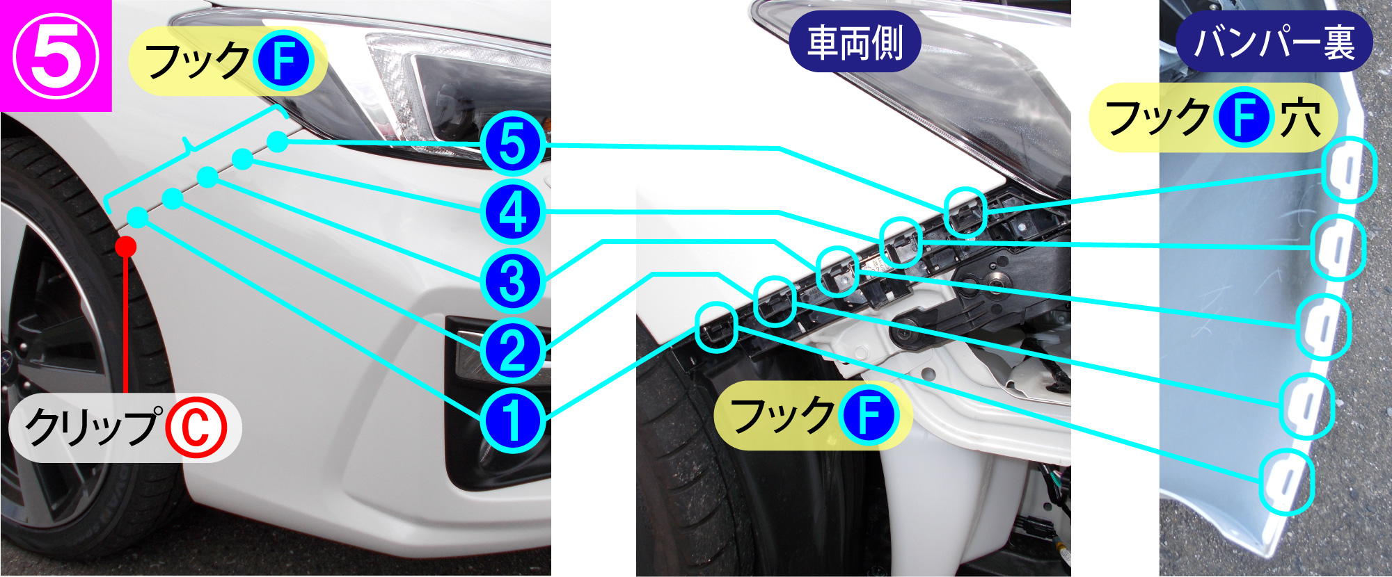 - タイヤハウス内のクリップC(左右各1箇所)を外し、バンパー両端部のフックF(左右各5箇所)を①~⑤の順番で外します。
