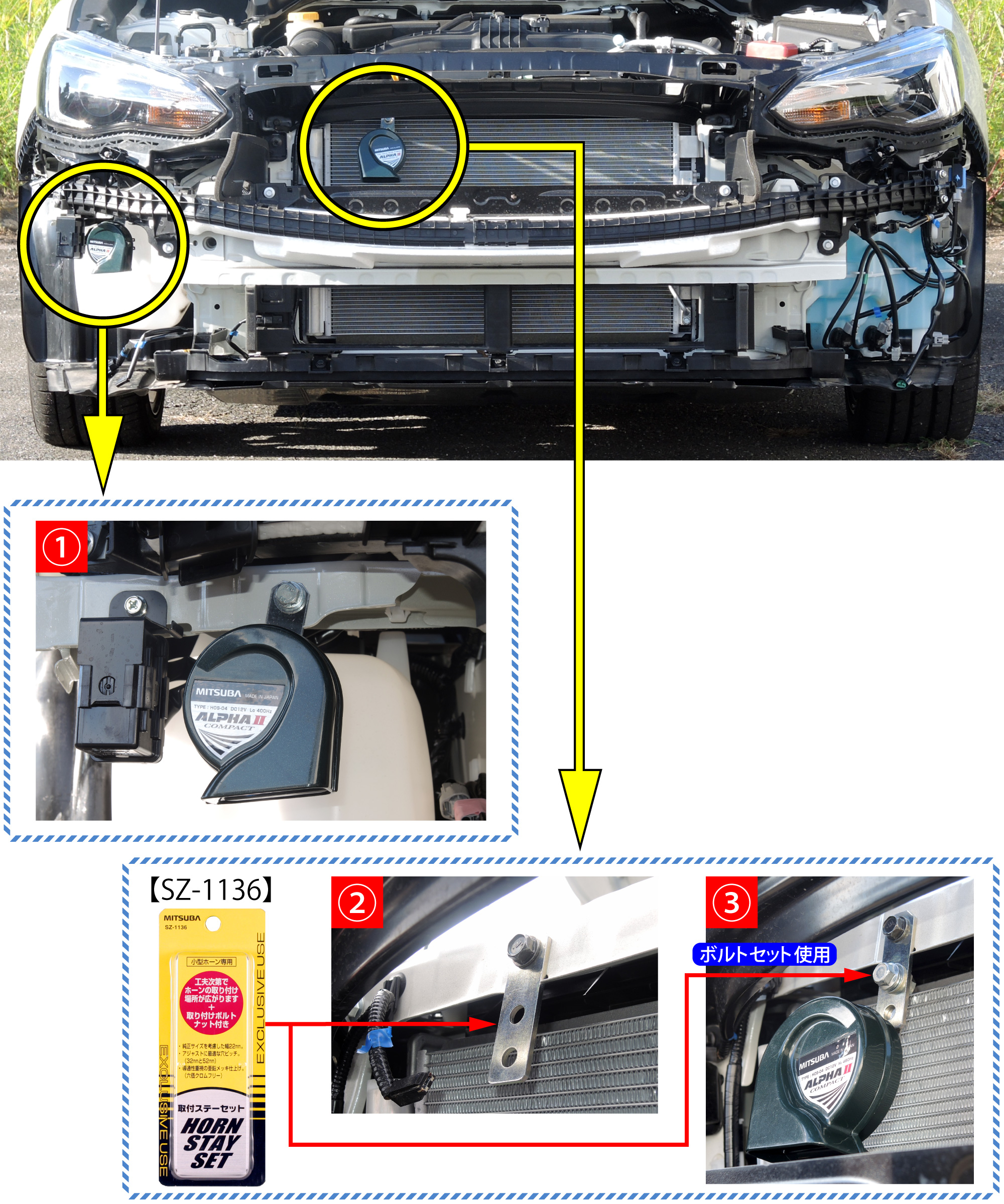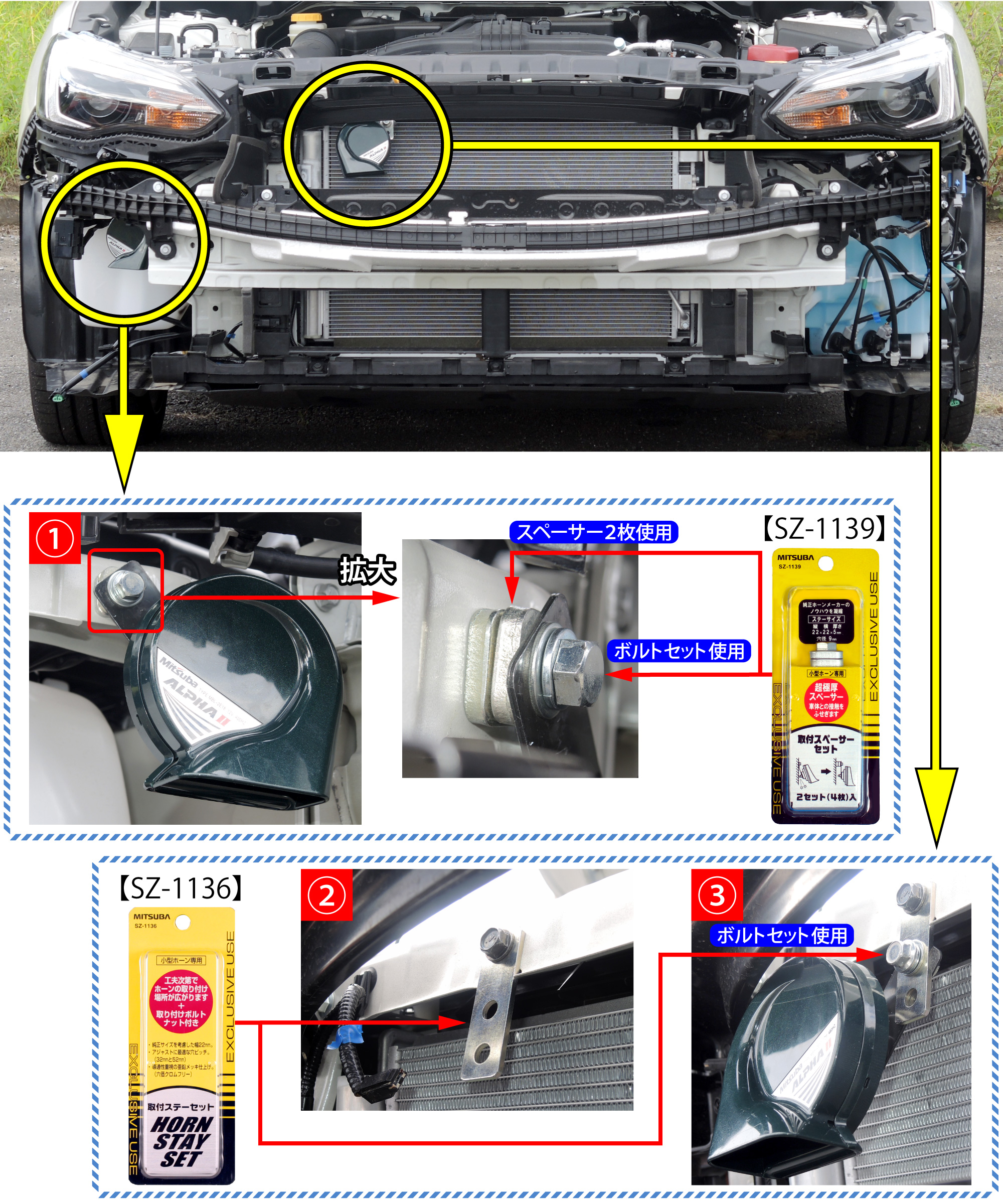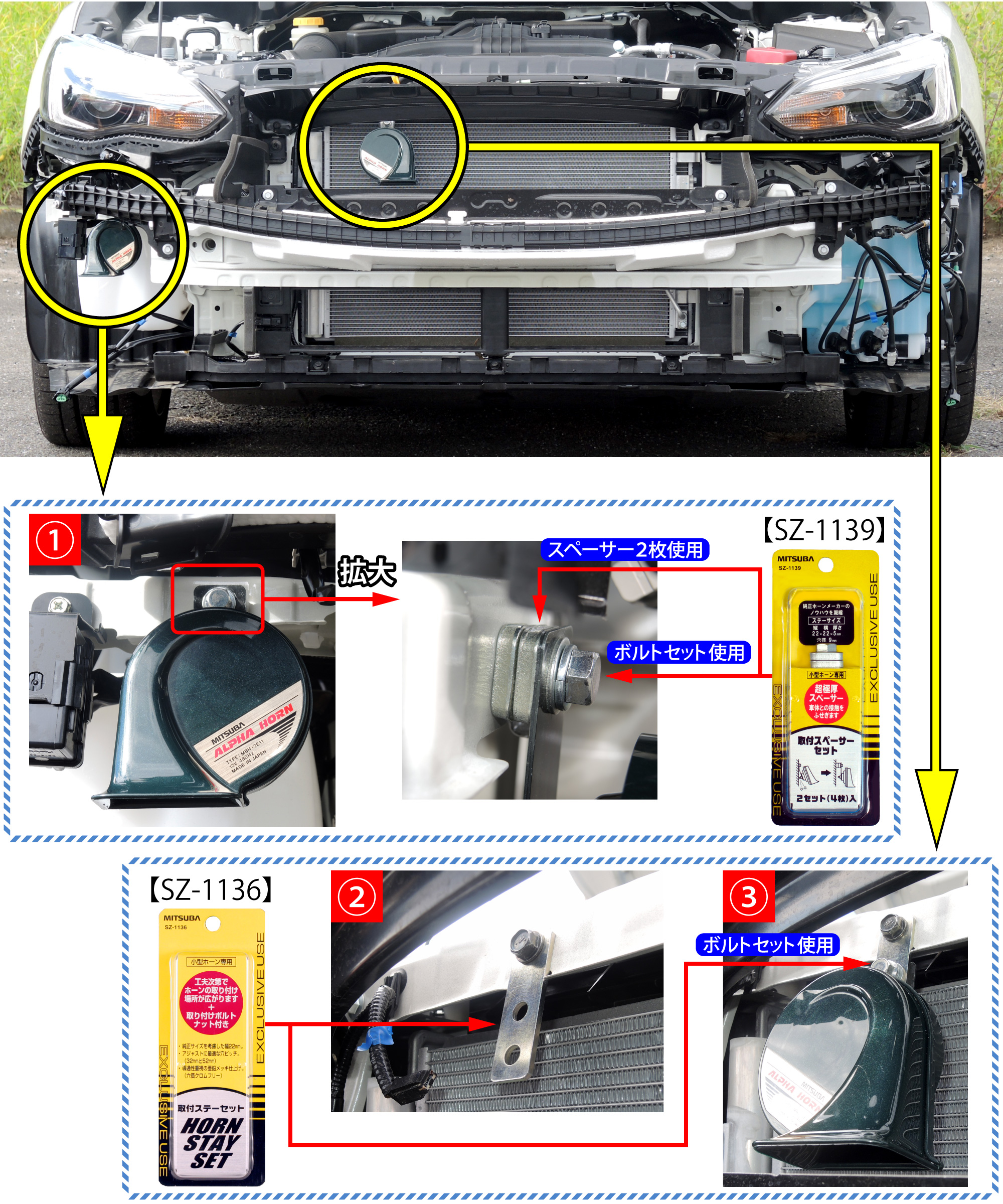 ①:純正ホーンの位置へスペーサー(SZ-1139)を画像のように2枚使用し、ボルトセット(取付スペーサーセット同梱)でホーンを固定します。