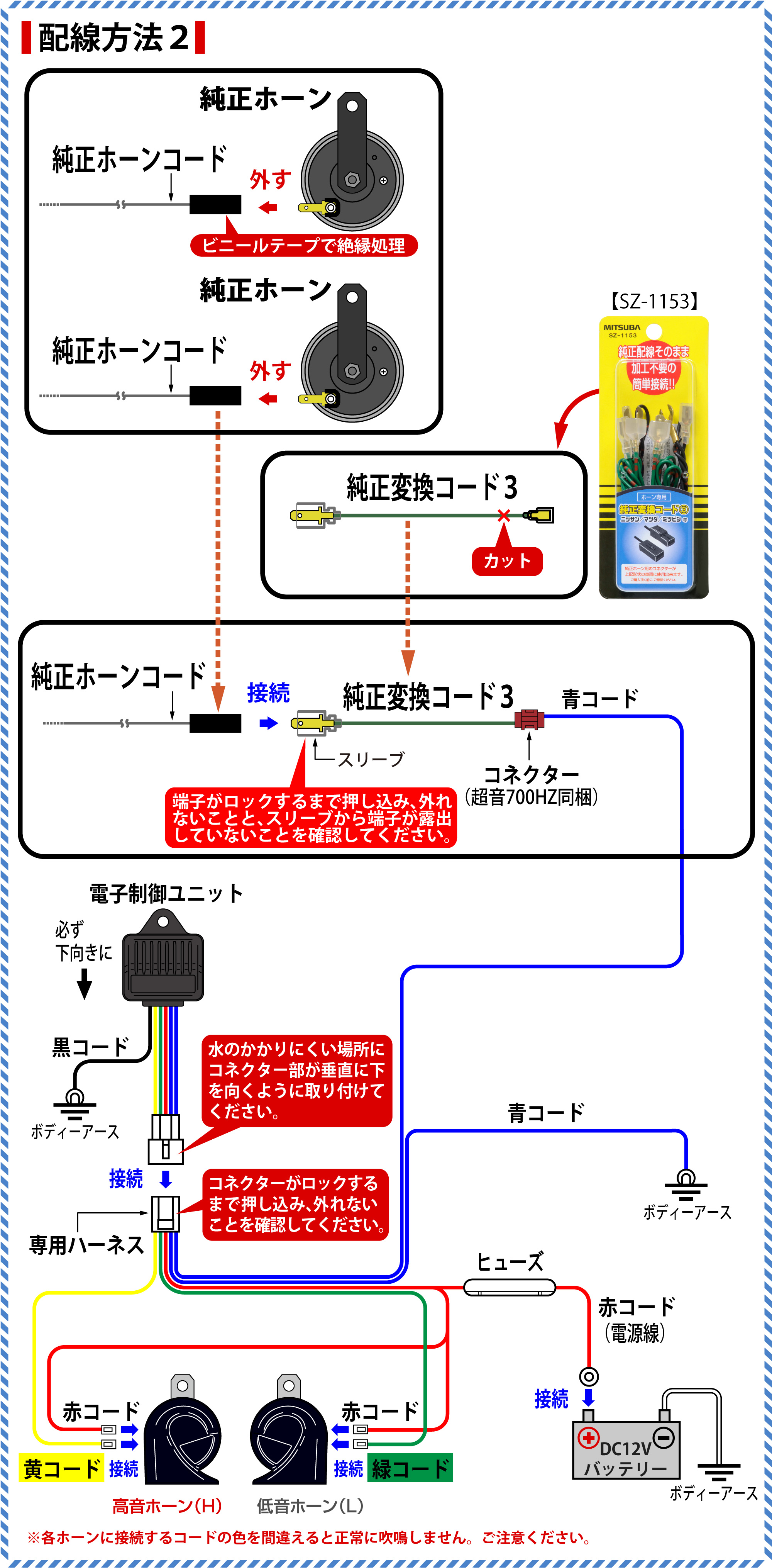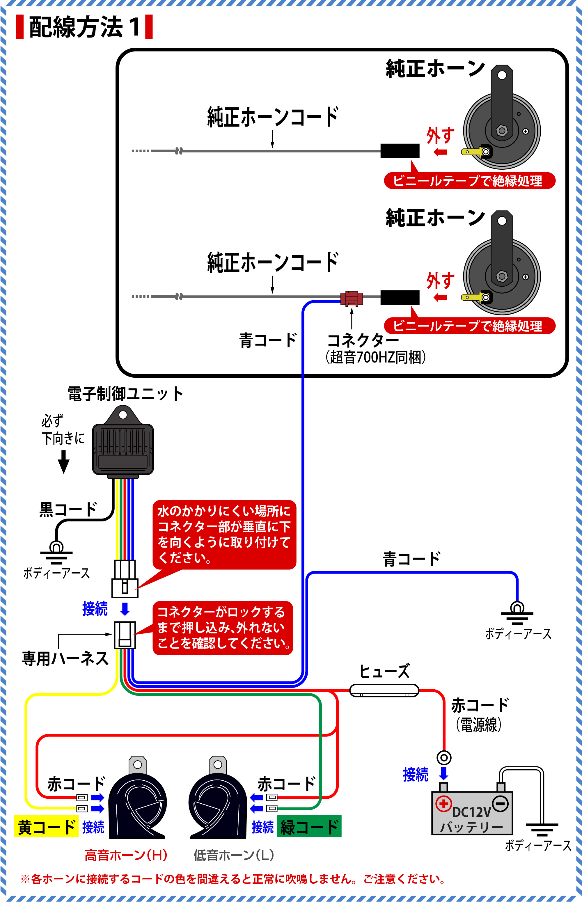 ※配線接続後は、ホーンボタンを押しホーンが正常に吹鳴するか確認してください。