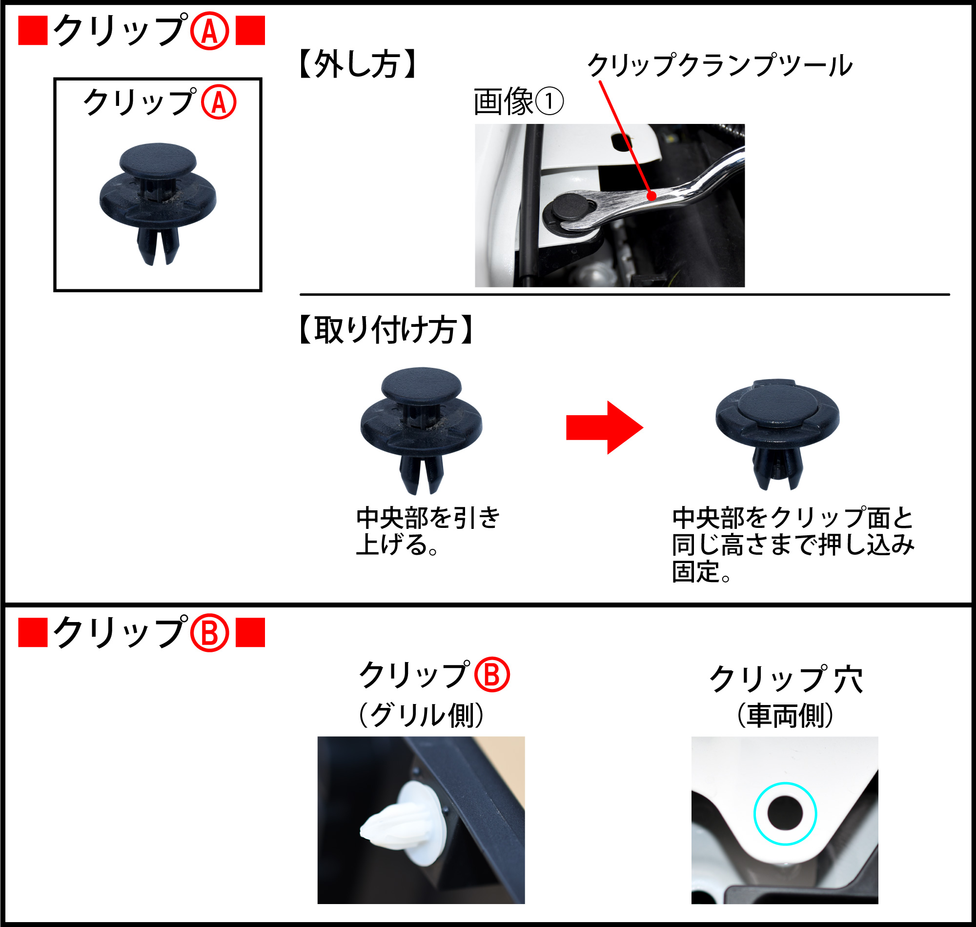 ※フックやクリップで固定された部分を力まかせに引っ張ると、フックやクリップ、グリルを破損させる恐れがありますので、十分注意して作業を行なってください。また、グリルに無理な力を加えると表面の白化や塗装のひび割れ、変形破損の原因となりますので、取り扱いには十分注意してください。