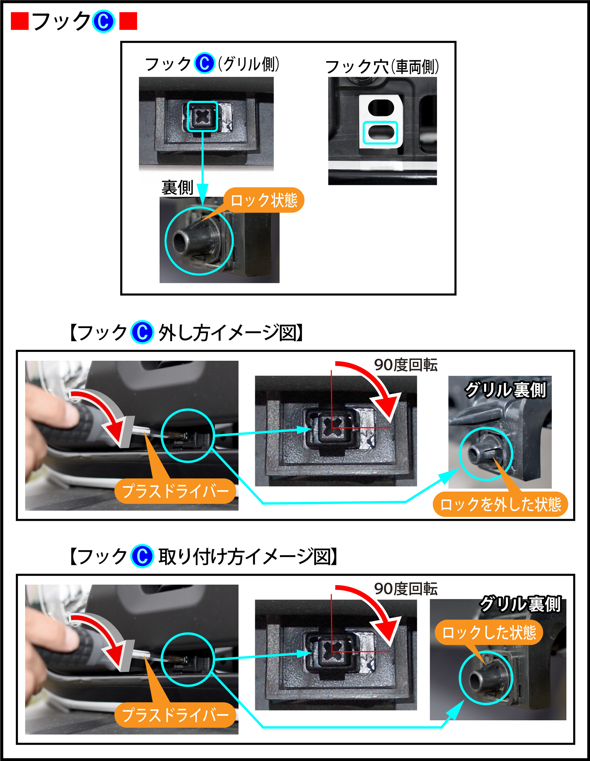 ロックが外された状態で、グリル裏にあるフックを車両側のフック穴へ挿し込み、『フックC取り付け方イメージ図』のようにプラスドライバーで90度回転させてロックします。