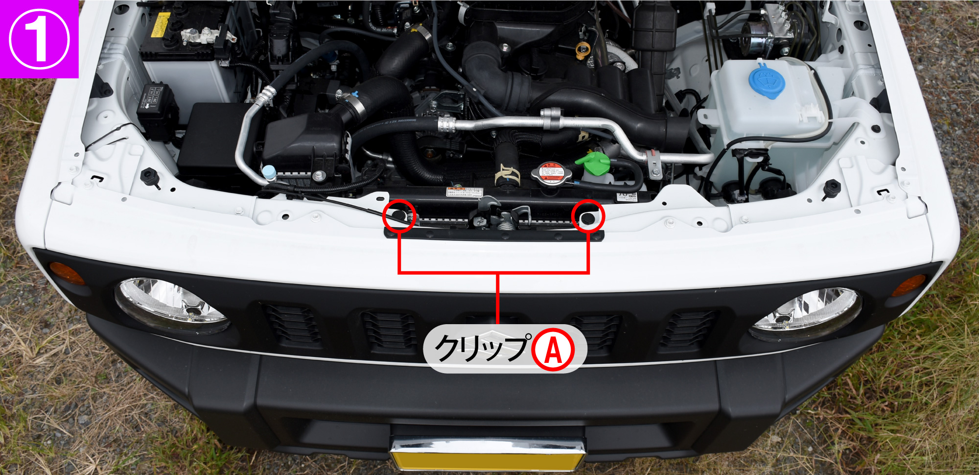 - ボンネットを開け、グリル上面のクリップA(2箇所)を外します。