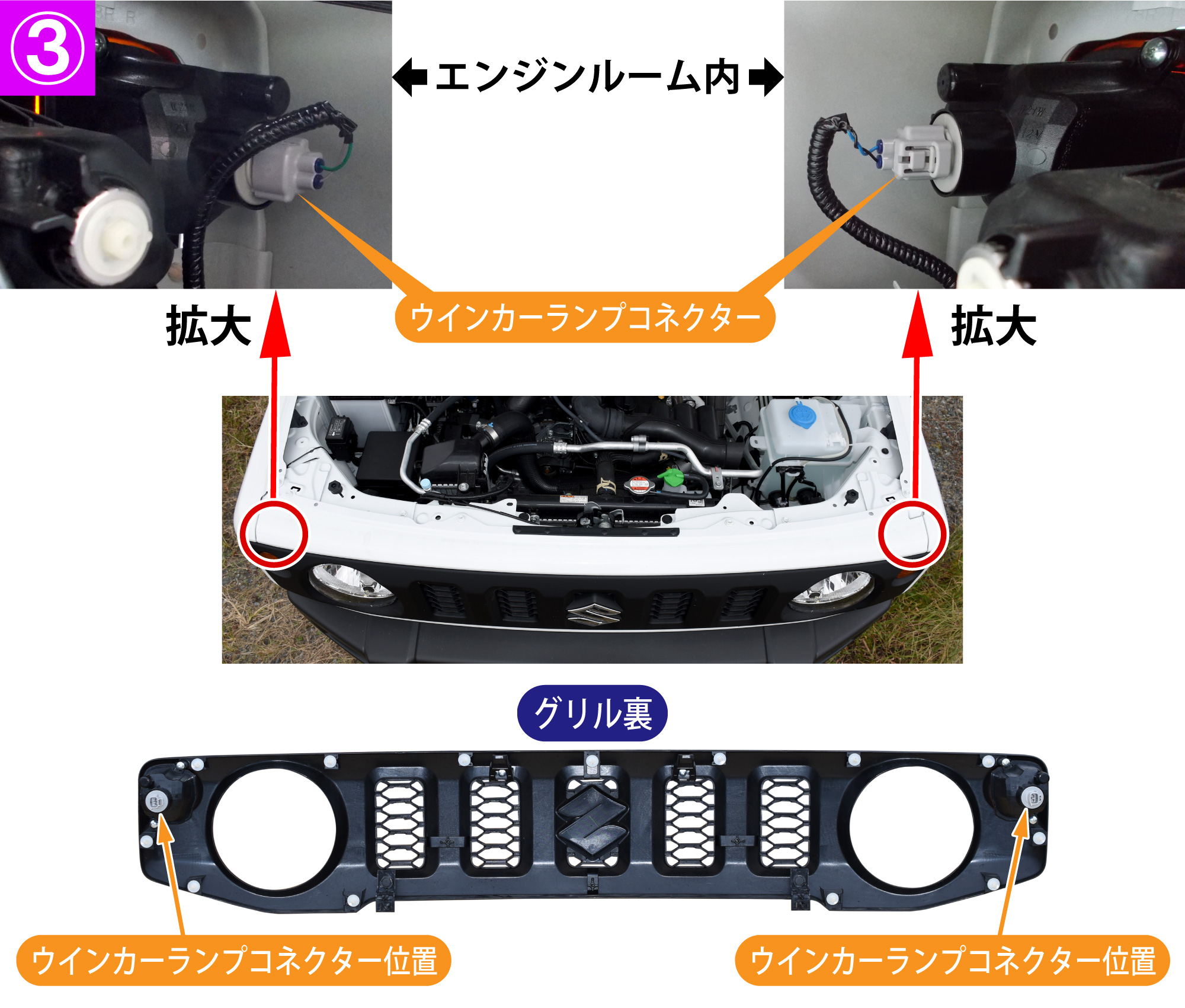 - ウインカーランプのコネクター(左右各1箇所)を外します。