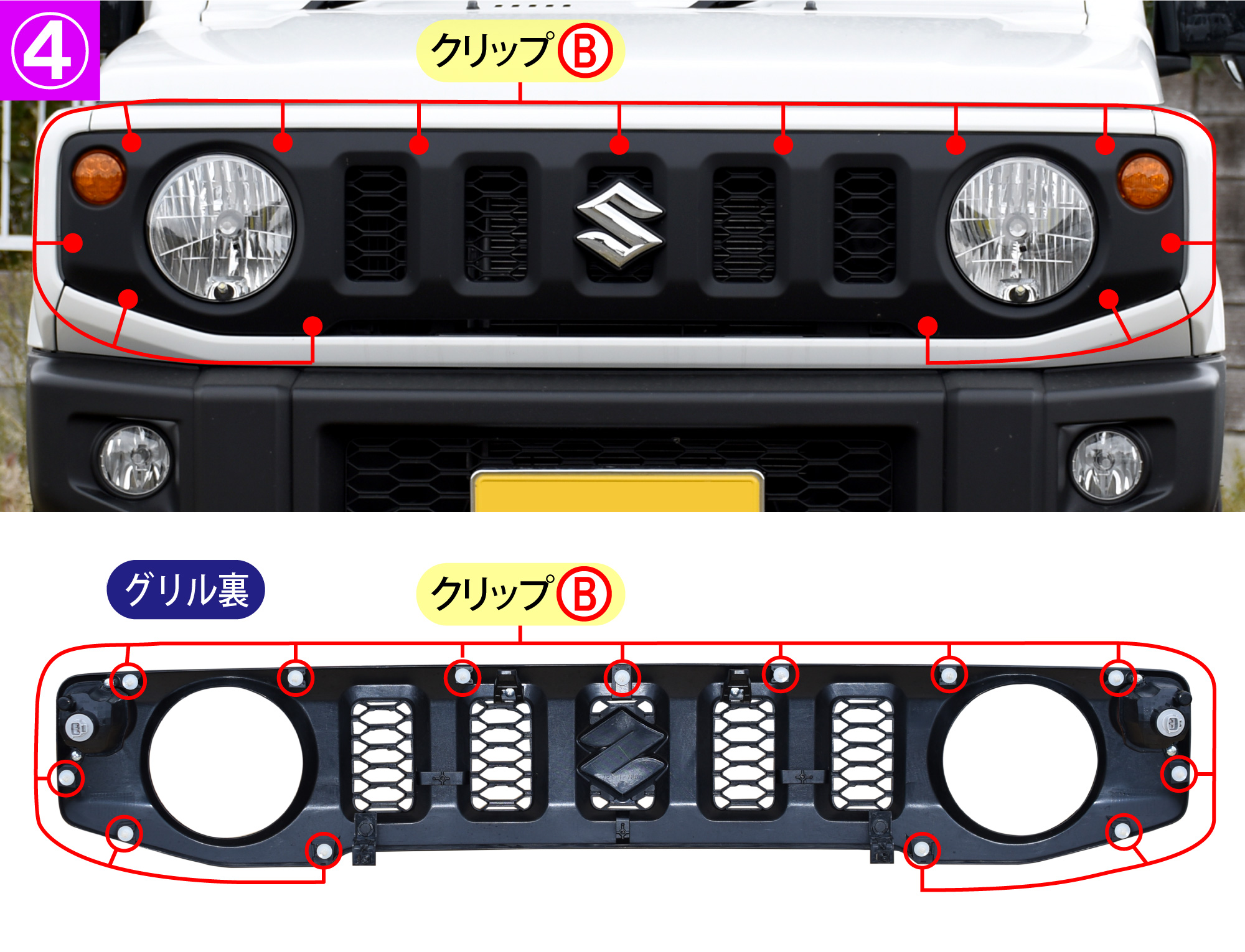 グリルの取り外しに自信の無い方は、ディーラーまたはカー用品店へ依頼されることをお薦めします。