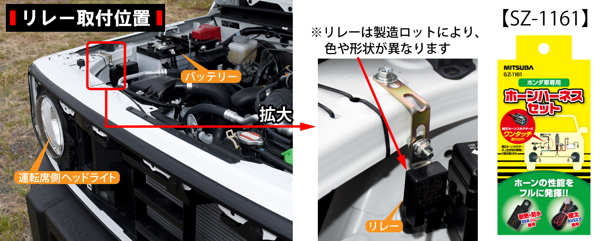 ※ホンダ車専用ホーンハーネスセット(SZ-1161)とは、リレー回路と純正配線へ傷付けずに接続出来るホンダ車専用のコネクターを組み込んだキットです。ミツバ製ホーンはもちろん、各メーカーのホーンも簡単・確実・短時間で配線出来ます。