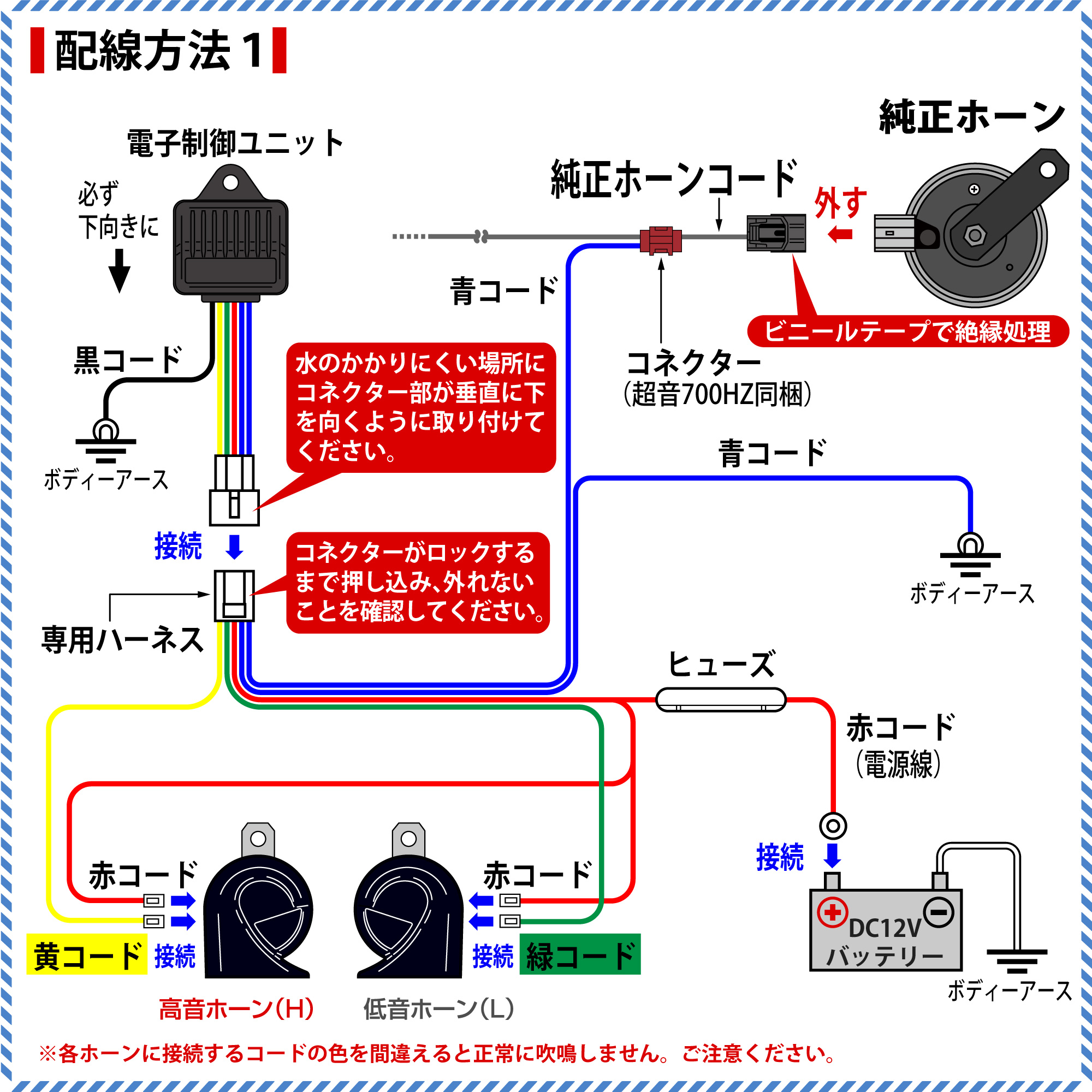 ホーンの配線は、超音700HZ同梱のハーネスを使用し、下記の何れかの方法で配線します。