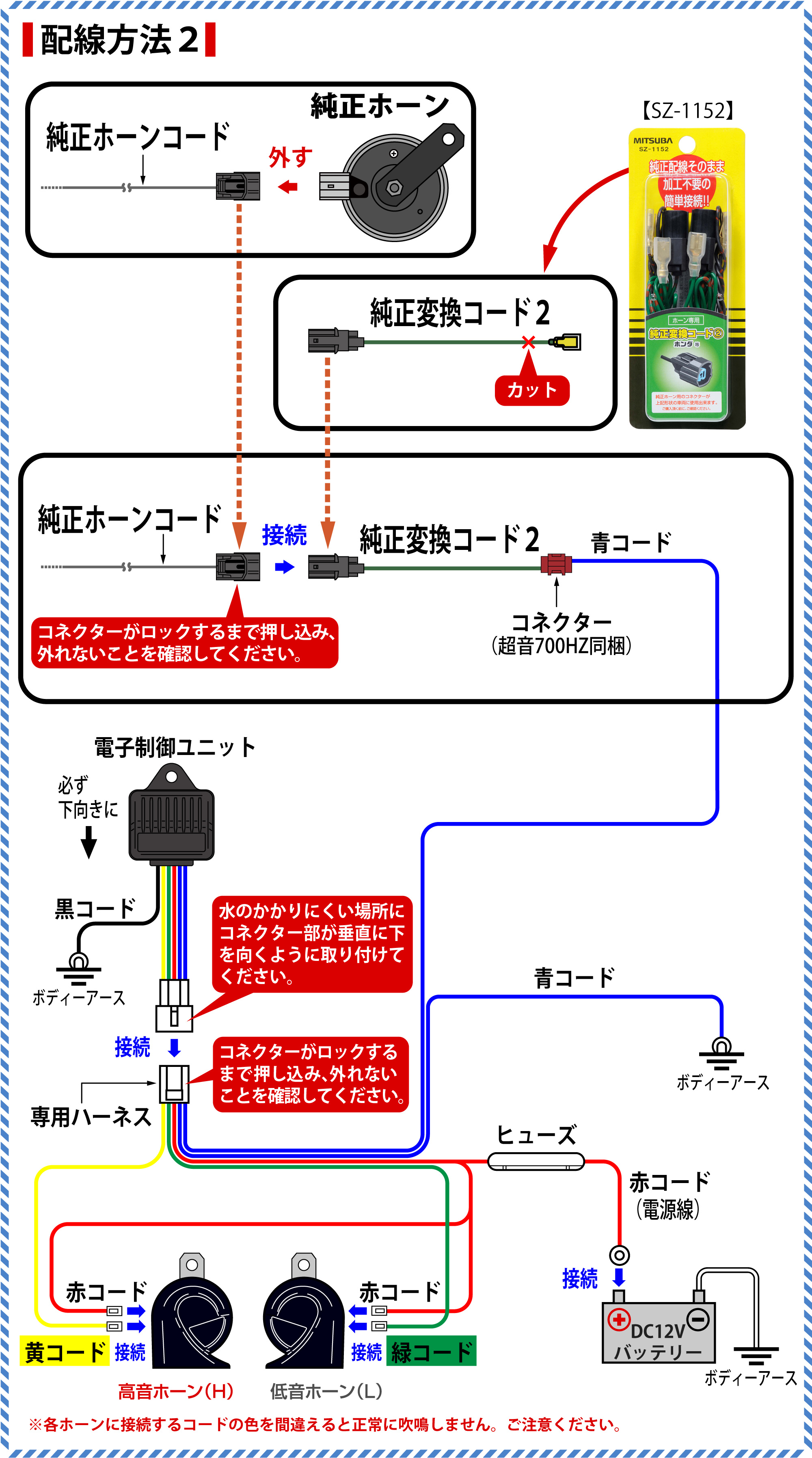 ※配線接続後は、ホーンボタンを押しホーンが正常に吹鳴するか確認してください。